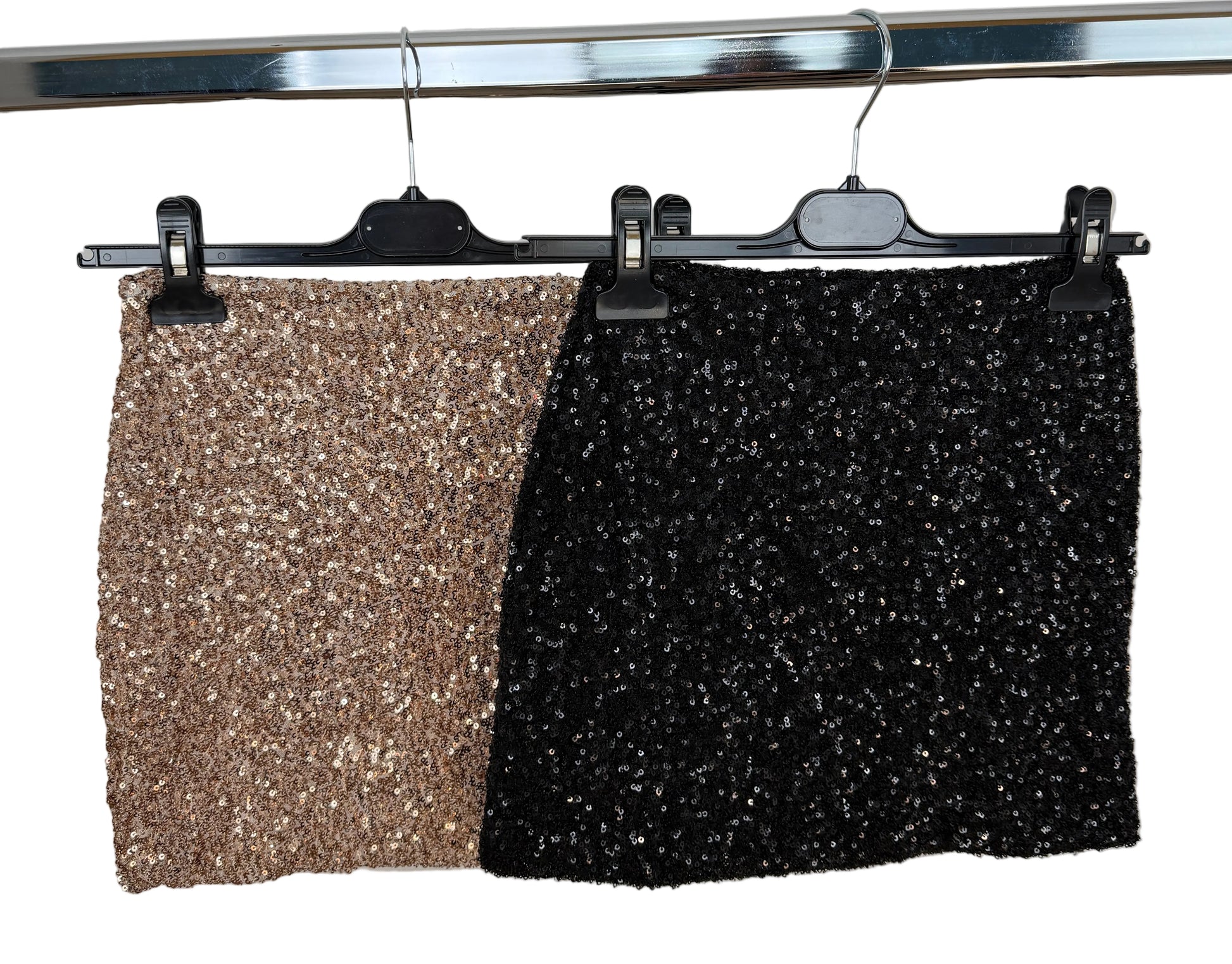Esta falda lentejuela está disponible en dos tonalidades elegantes: champán y negro, permitiéndote elegir según tu preferencia estética.