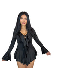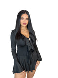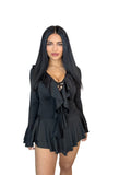 Talla única: S–L. Color: negro. Mono corto con vuelo tipo falda, escote en V con cruce y tiras, volante frontal y lazo ajustable. Manga larga con puño acampanado. Tejido fluido que se adapta y realza la figura. Elegante y cómodo para eventos o noche.