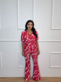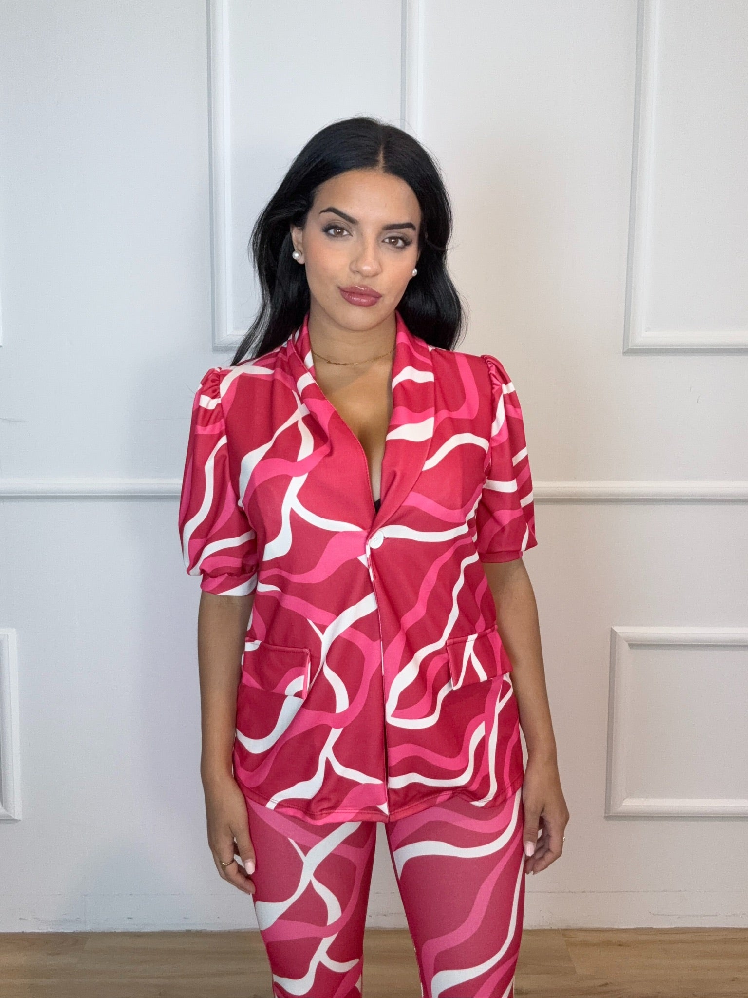 The Fuchsia Málaga Suit elevates any outfit with its lightweight blazer and flared trousers. The wave print in shades of fuchsia and pink visually elongates the figure, while the drapey fabric comfortably fits sizes S to L.