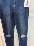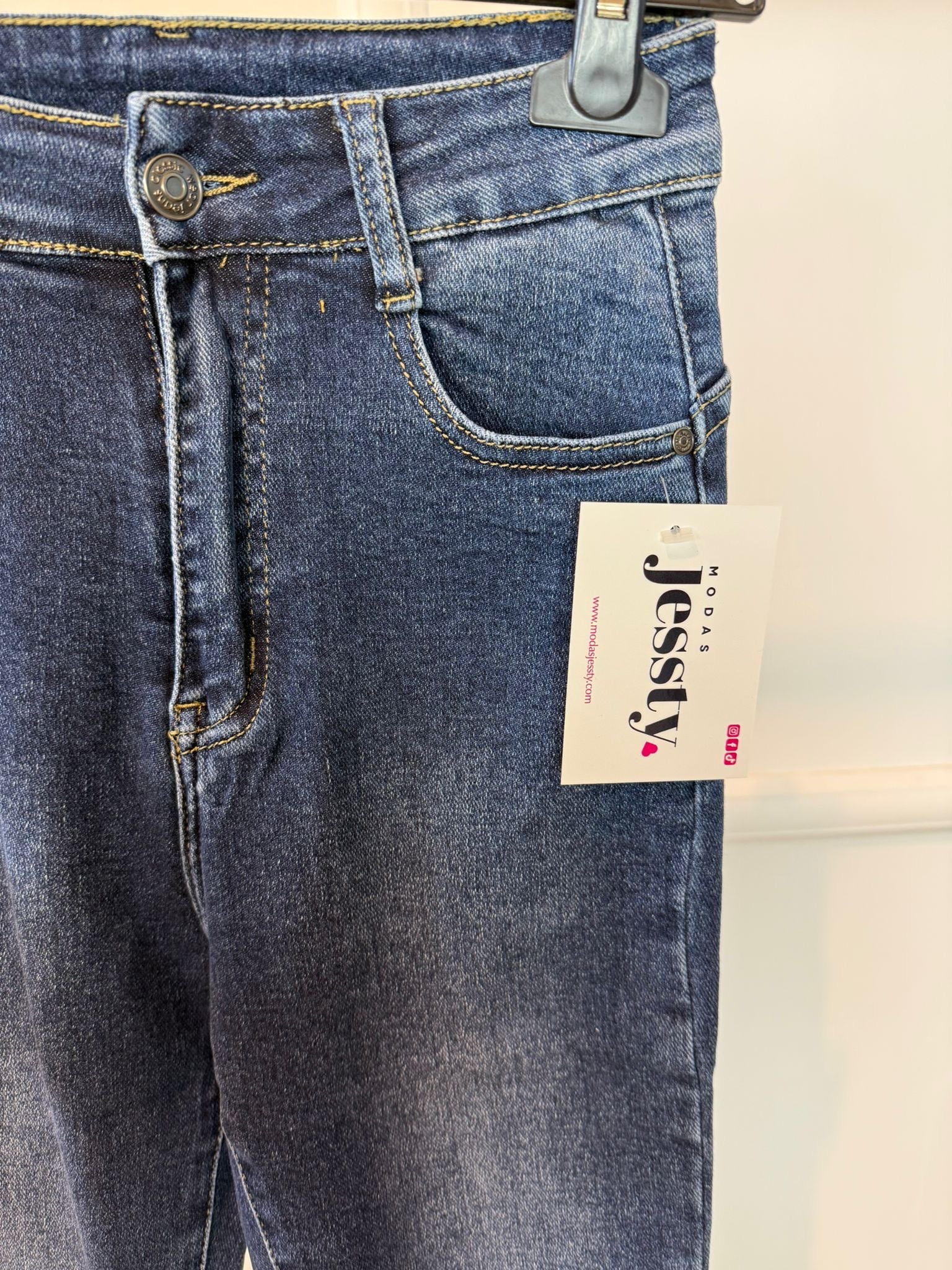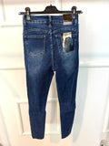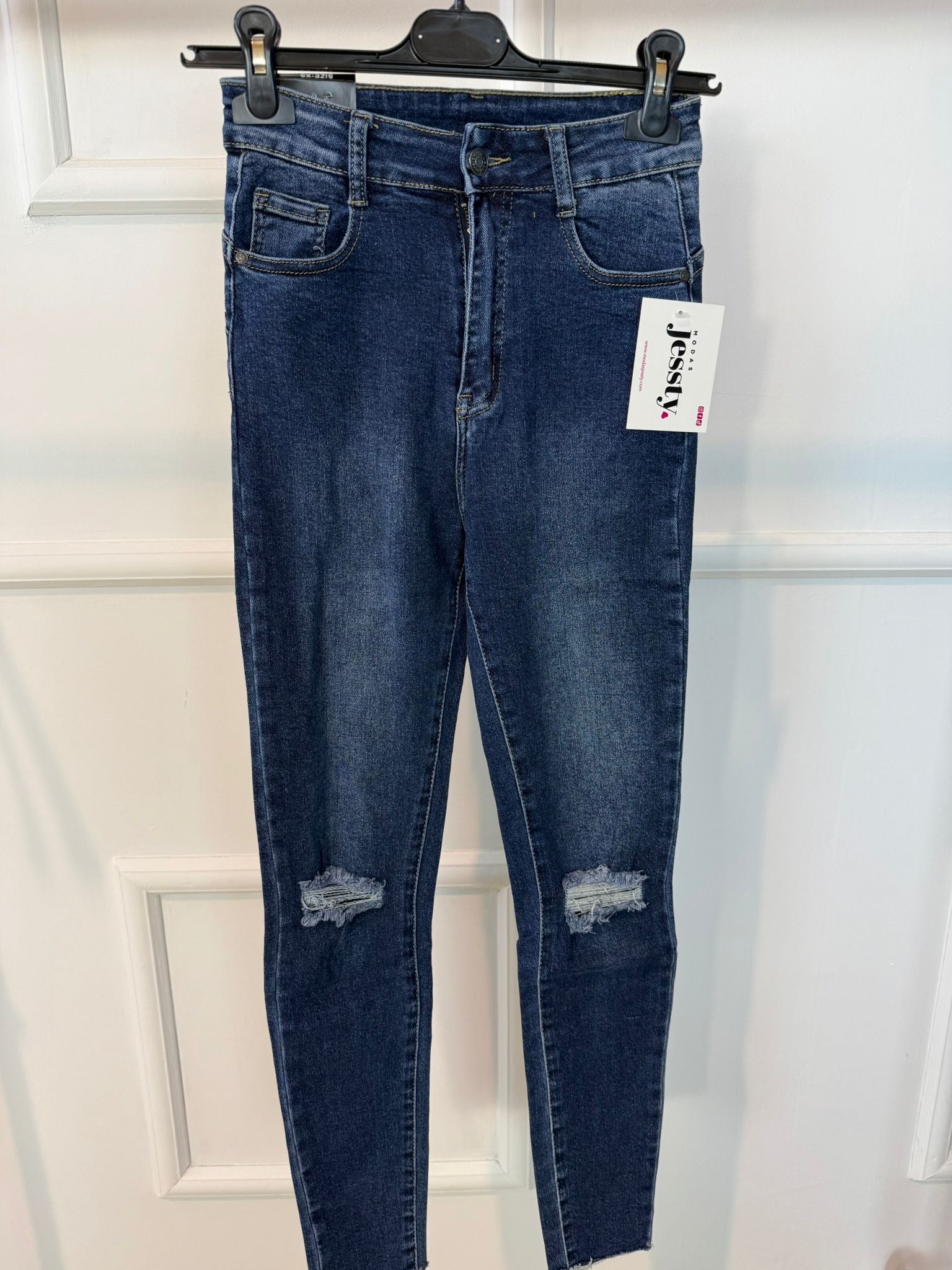 Talla XS. Color: azul denim. Vaquero pitillo de tiro medio con rotos en las rodillas, cinco bolsillos y cierre de botón y cremallera. Cinturilla con trabillas y efecto lavado que estiliza; cómodo para looks casual del día a día.