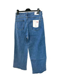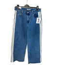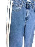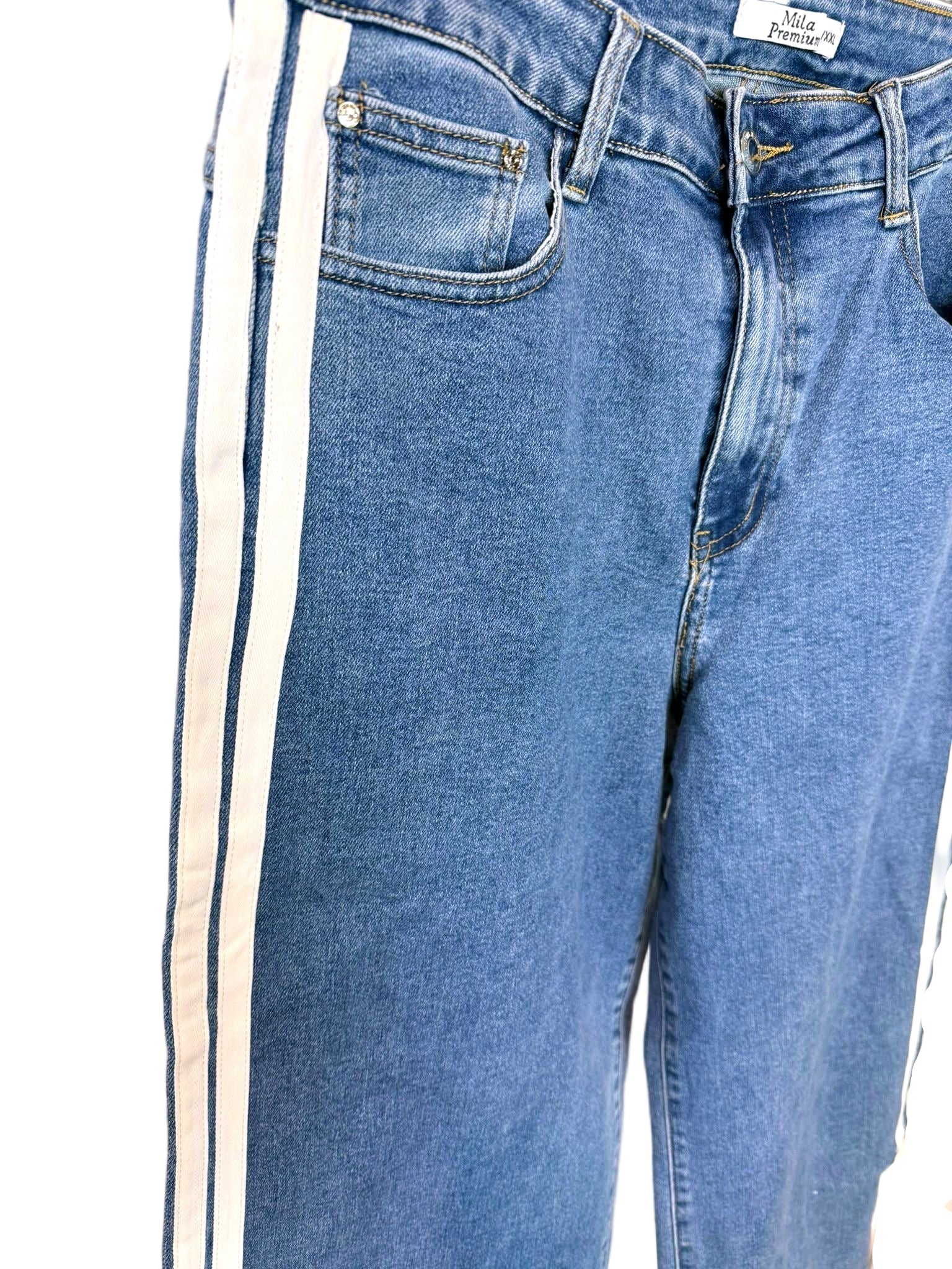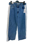 Talla 44. Color: azul denim con bandas laterales blancas. Vaquero Isabel de pierna ancha y corte recto, estilo sporty. Cintura media con trabillas, cinco bolsillos y cierre de botón y cremallera. Tejido cómodo y resistente, perfecto para looks casual con zapatillas o sandalias.
