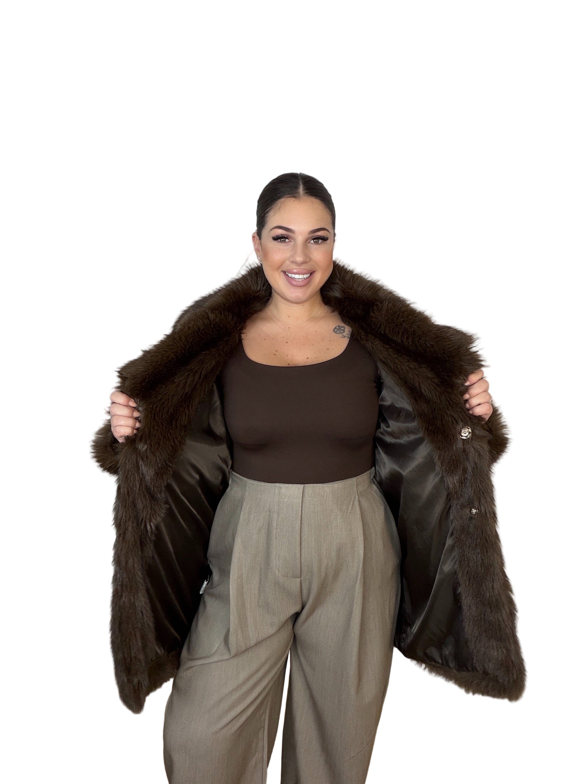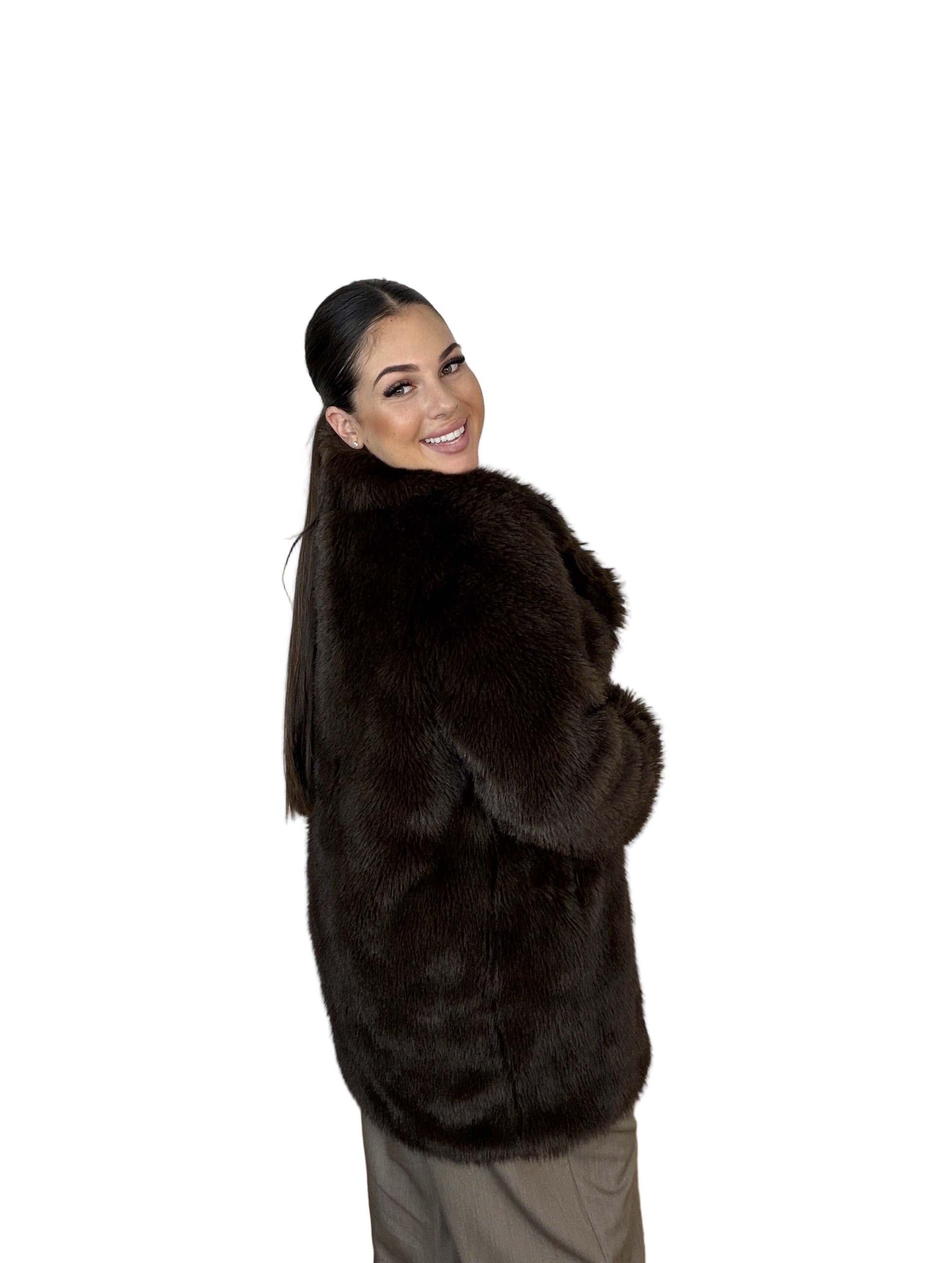 Talla única: S–L. Abrigo Marbella de pelo suave con gran solapa y cierre de botones. Forrado, cálido y ligero, corte recto a medio muslo y mangas amplias para superponer. Ideal para elevar looks diarios o de noche.