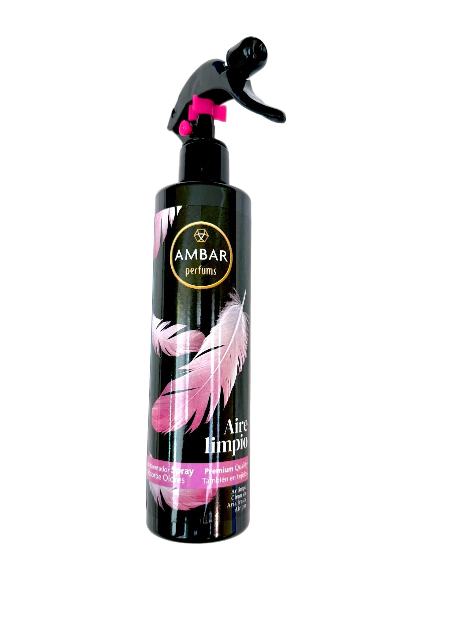 Ambientador en spray Ambar Aire Limpio, ideal para mantener un aroma fresco en cualquier espacio. Neutraliza y absorbe olores, dejando una fragancia suave y duradera. Apto también para tejidos, aportando sensación de limpieza y bienestar en el hogar.