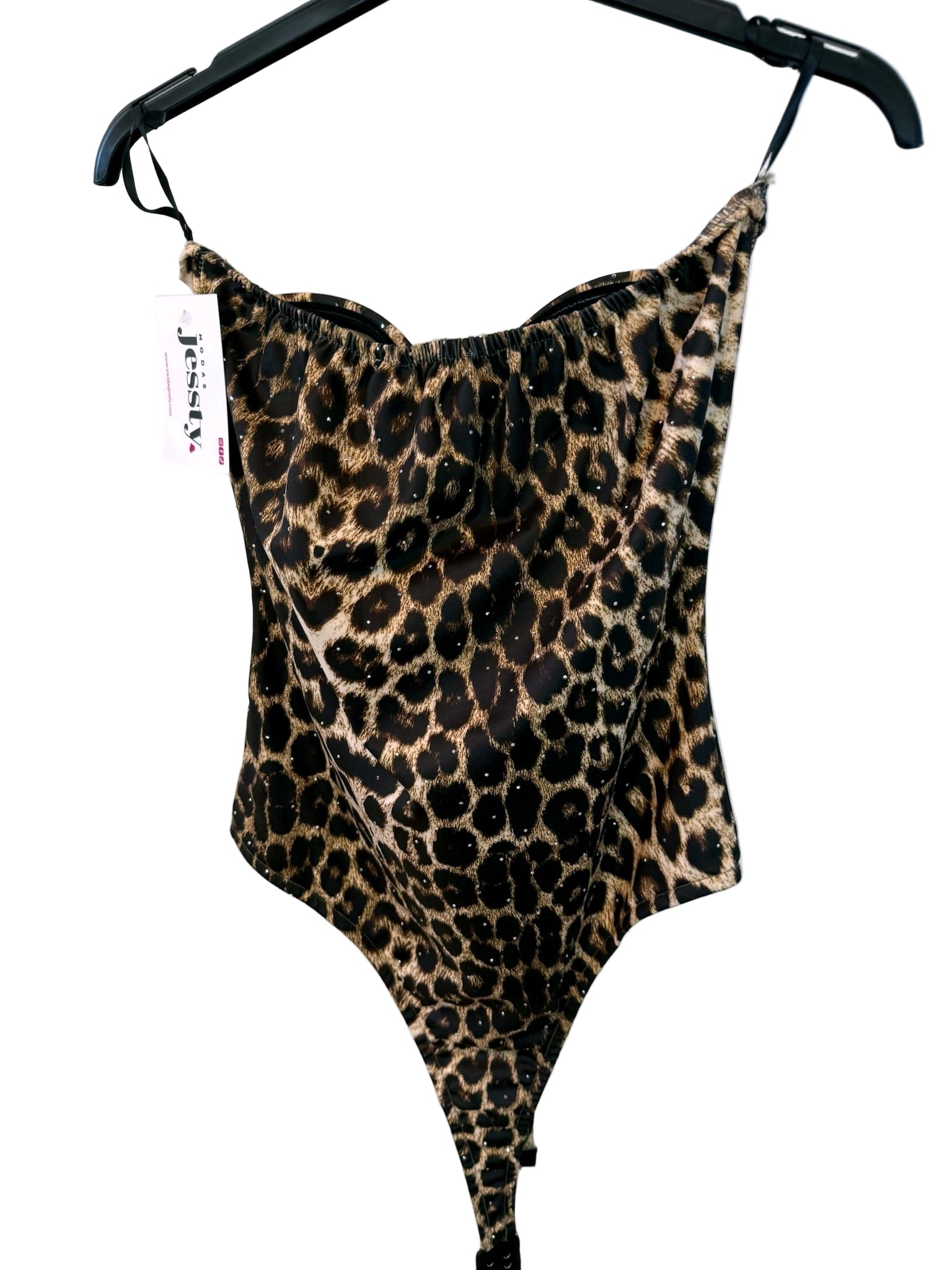 Tallaje: Talla Única (S–L). Color: Leopardo. Body sin tirantes con escote corazón y copas formadas para realce y sujeción. Tejido suave y elástico que se adapta al cuerpo, cómodo y favorecedor. Perfecto para combinar con vaqueros, faldas o sastrería y crear un look potente.