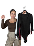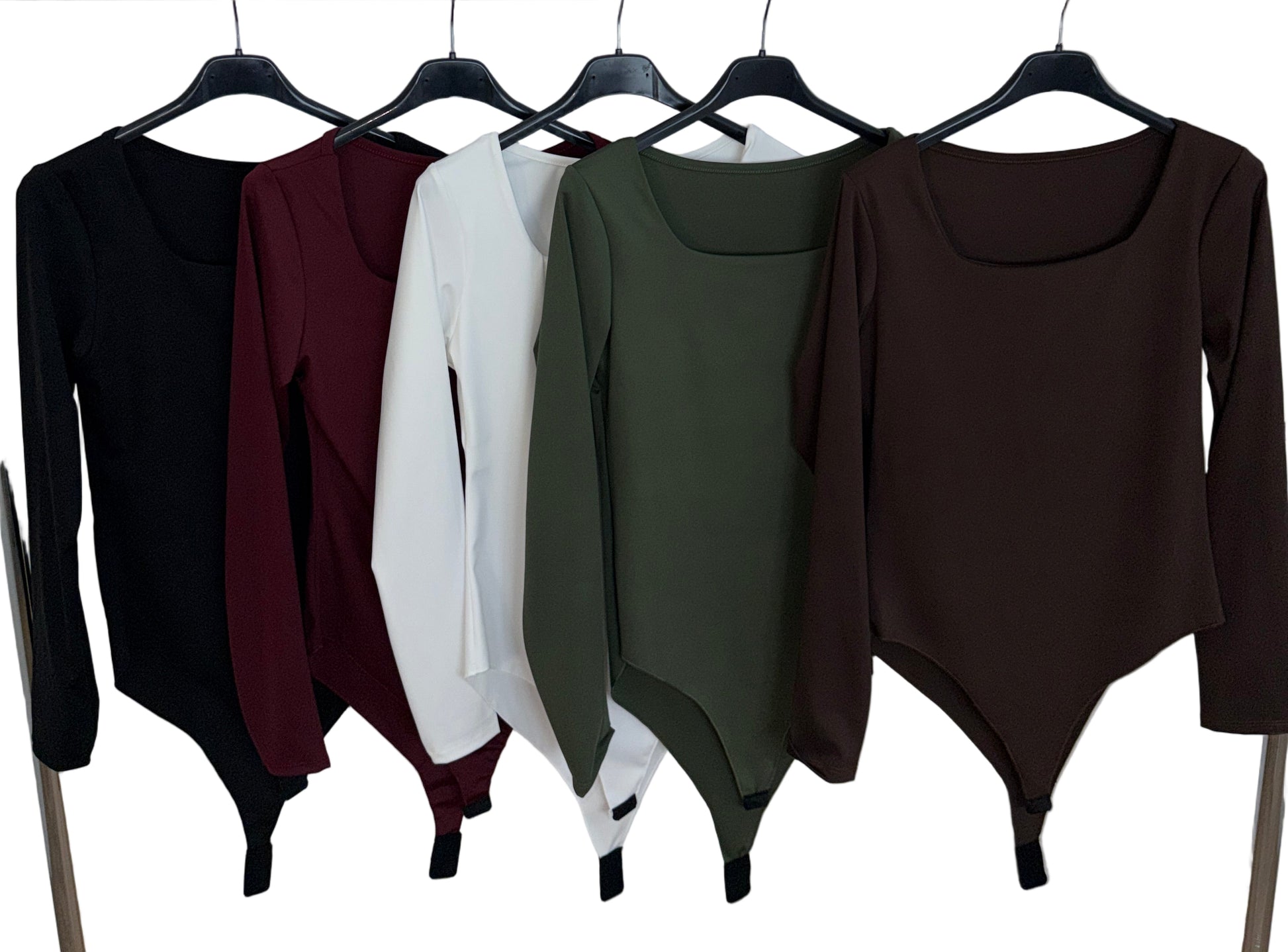 Talla Única: da desde la S hasta la L. Colores: Blanco, Negro, Marrón, Verde y Burdeos. Body de licra suave con escote cuadrado y manga larga; tejido elástico que se adapta y realza la figura. Cierre de corchetes para mayor comodidad. Versátil para looks diarios o más arreglados.