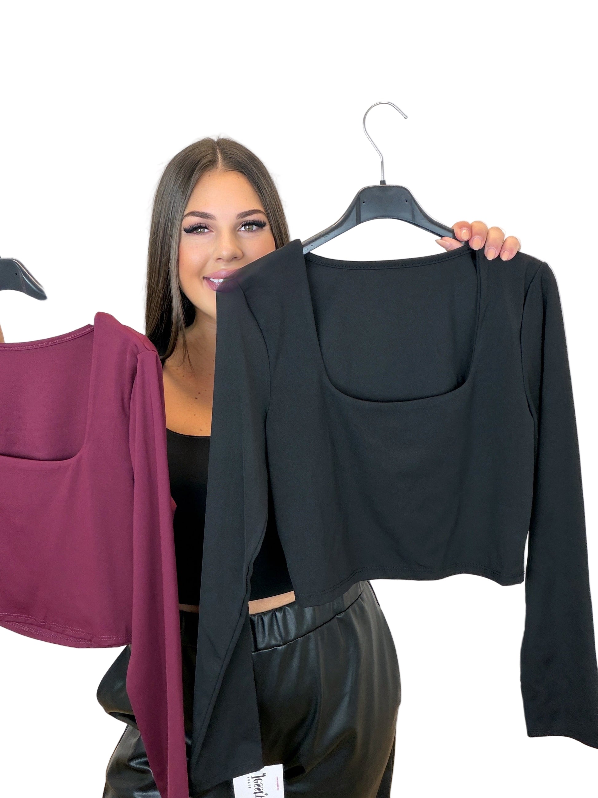 Talla única S–L. Colores: Negro y Burdeos. Camiseta de manga larga con escote cuadrado y corte crop. Tejido suave y elástico que se adapta sin marcar, cómoda y favorecedora. Ideal para diario o noche; combínala con vaqueros o polipiel.