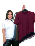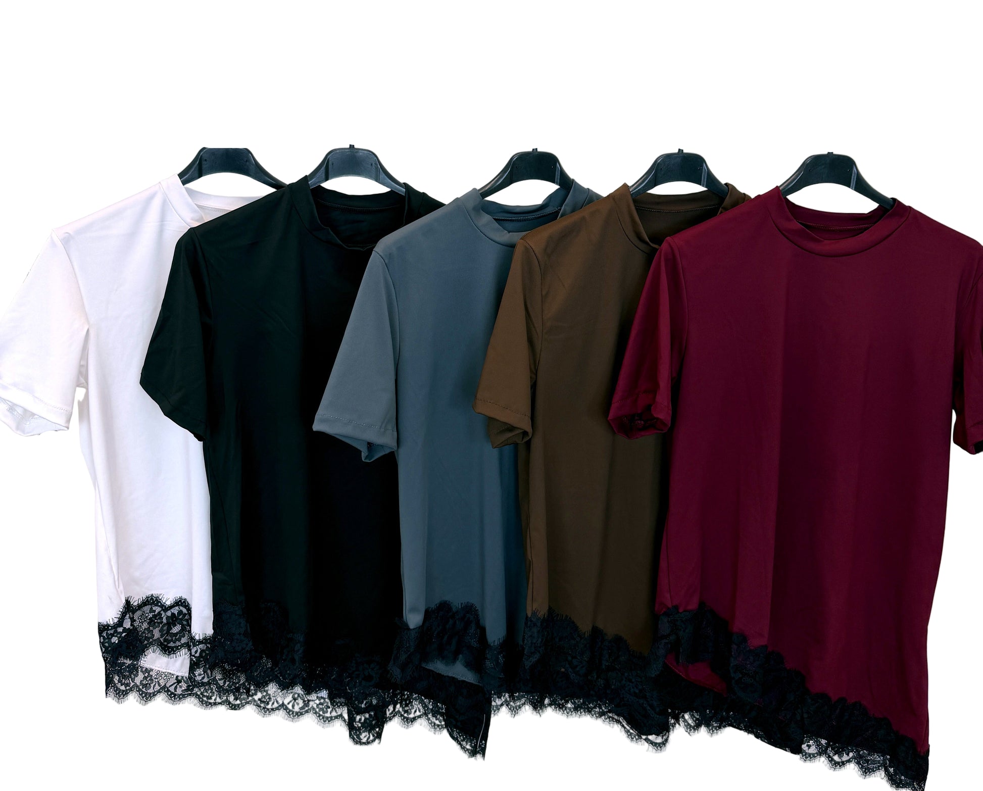 Talla Única (da de S a L). Colores: Blanco, Negro, Gris, Burdeos y Marrón. Camiseta de corte suelto y manga corta, cuello redondo y bajo asimétrico con encaje para un toque sofisticado. Suave y cómoda, perfecta para combinar con vaqueros o polipiel en looks diarios o más arreglados.