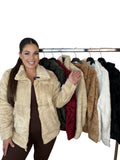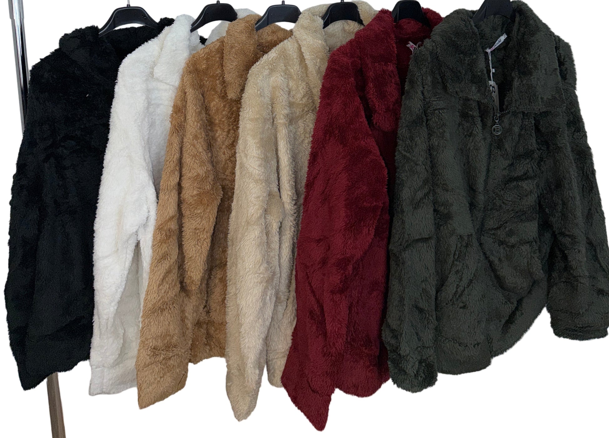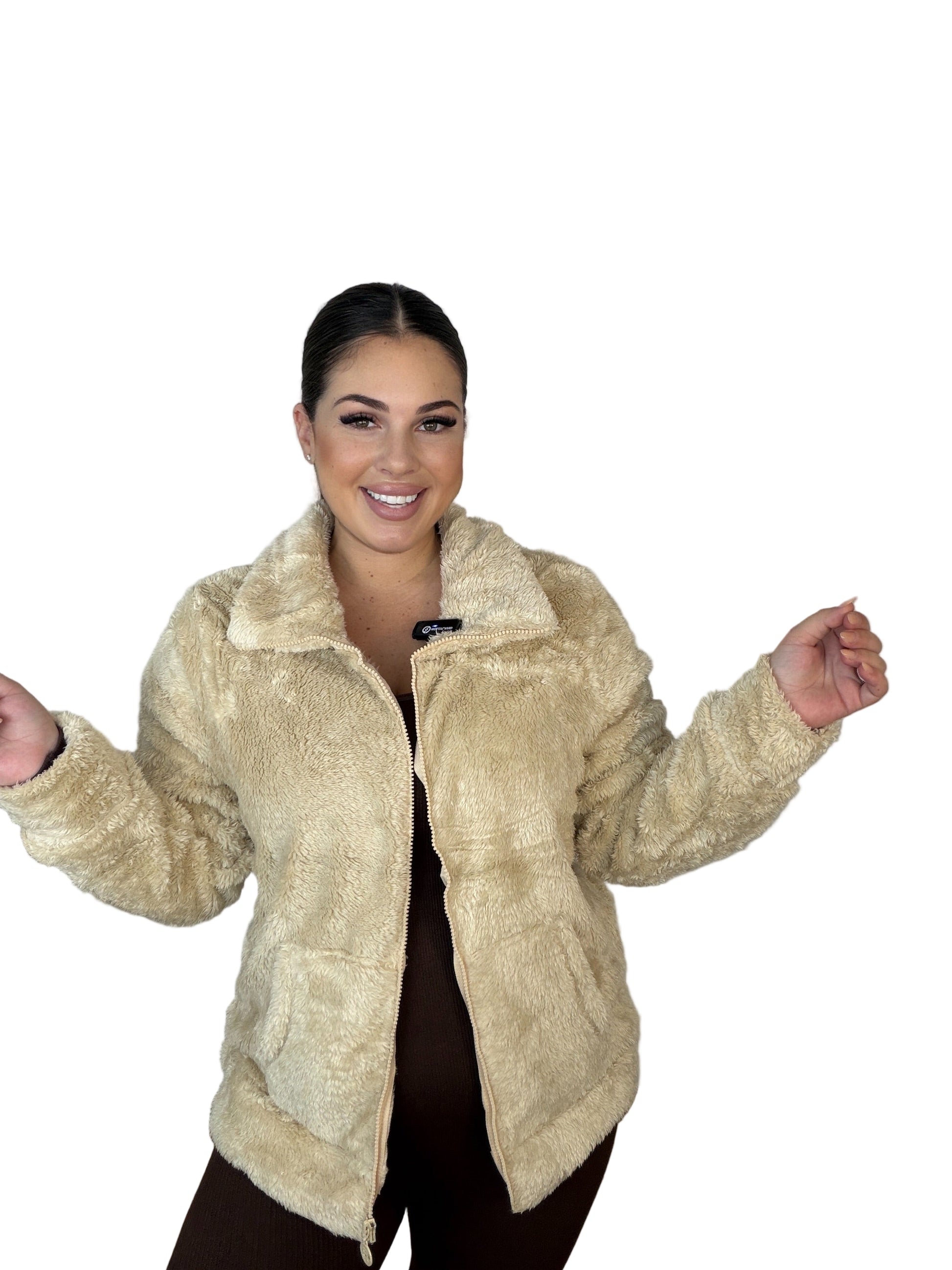 Tallaje: corte holgado, se adapta a distintas figuras. Colores: Negro, Blanco, Beige, Burdeos, Verde y Camel. Chaqueta efecto peluche súper suave con cuello alto, cremallera frontal y bolsillos. Abrigo ligero y muy cálido, perfecto para el día a día y combinar con jeans o leggings.