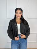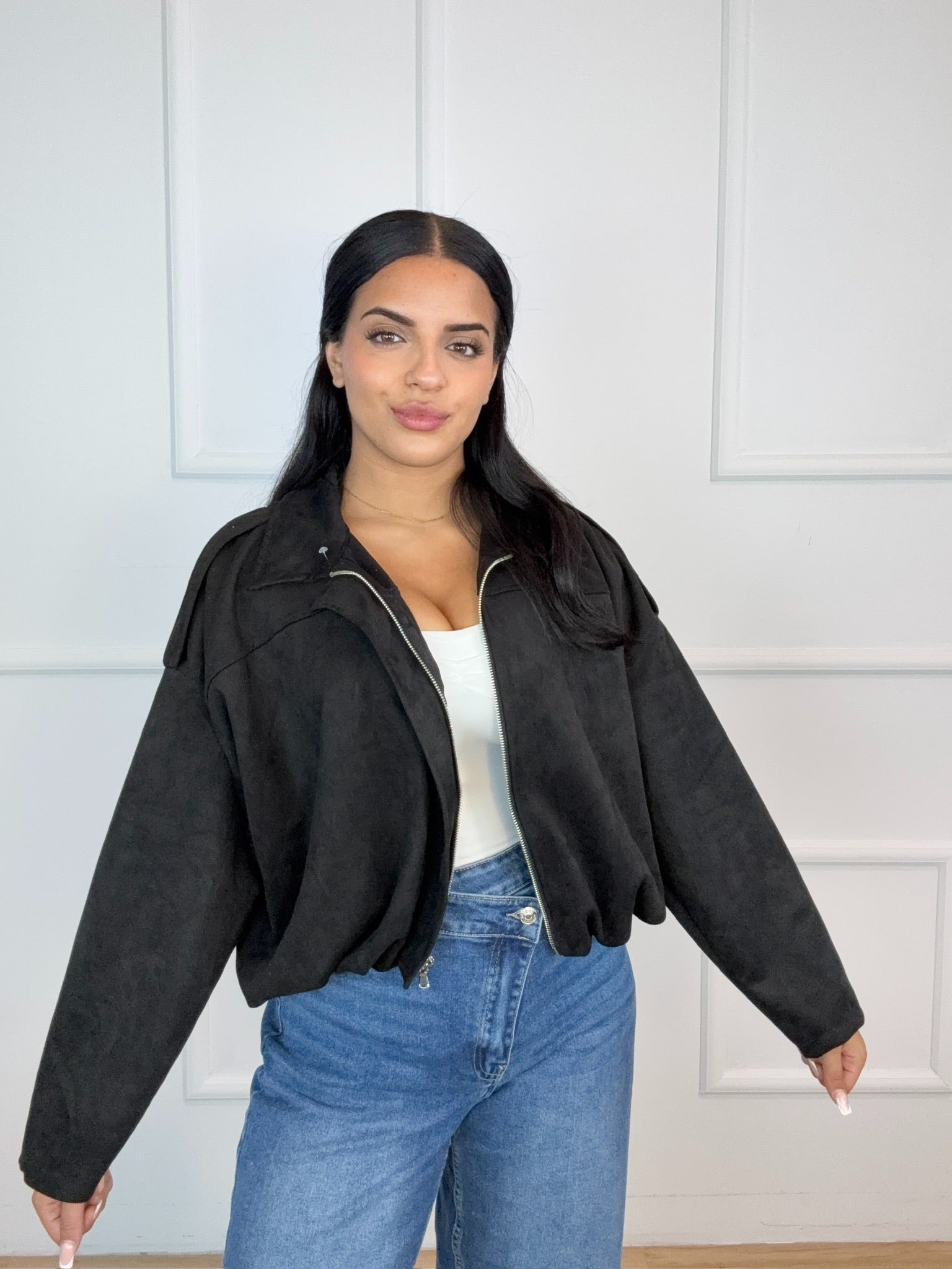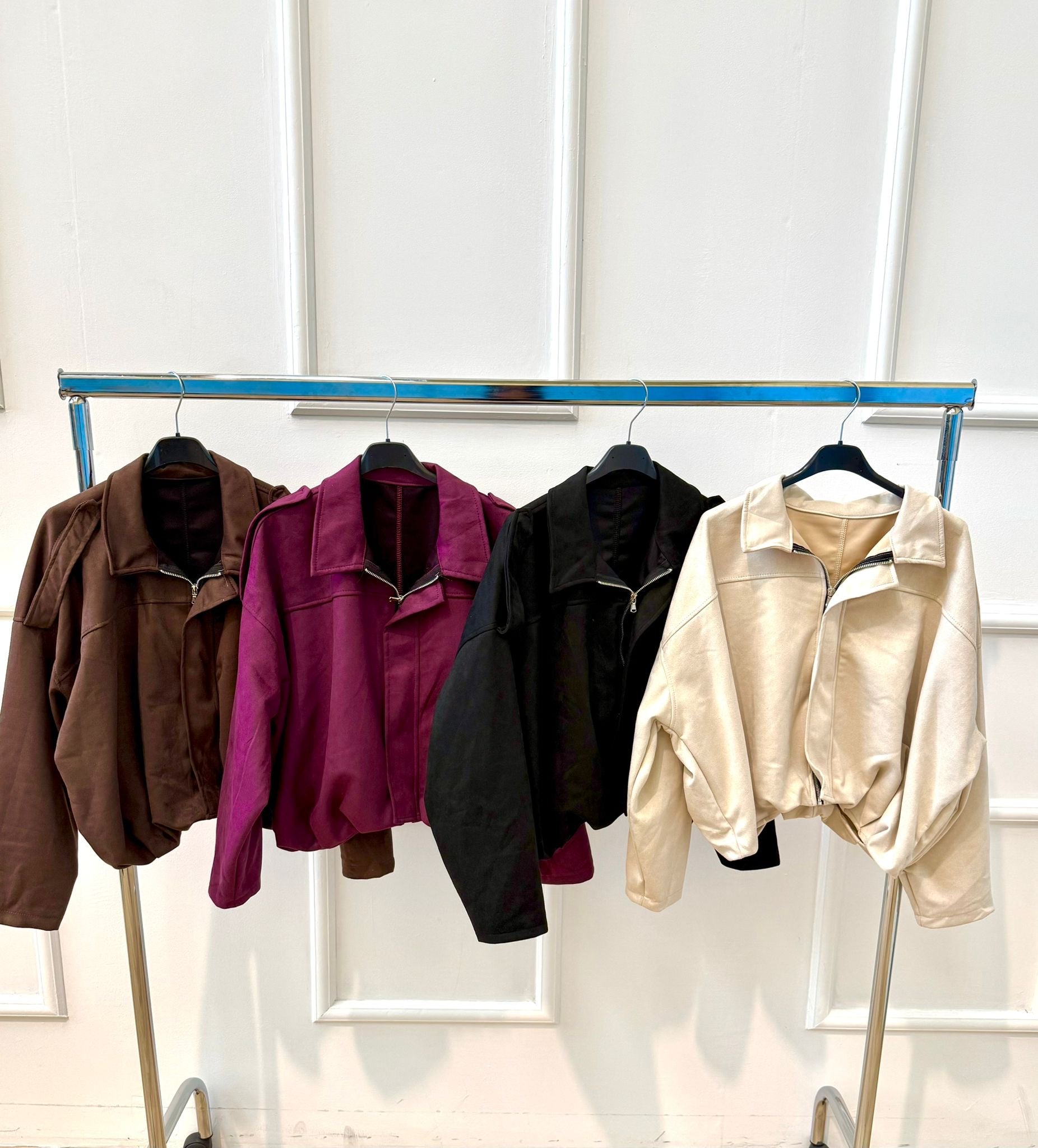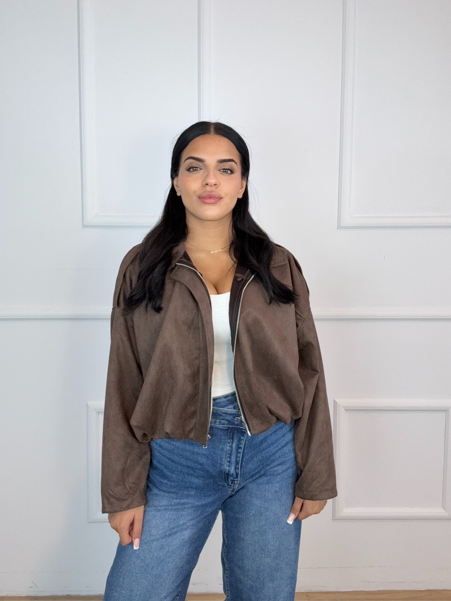 Tallaje: Talla Única (S-L). Colores: Negro y Marrón. Chaqueta corta de estilo urbano, con caída fluida y hombro relajado. Tacto suave, cierre de cremallera y cuello camisero. Ligera y versátil para el día a día; combínala con vaqueros o vestidos.