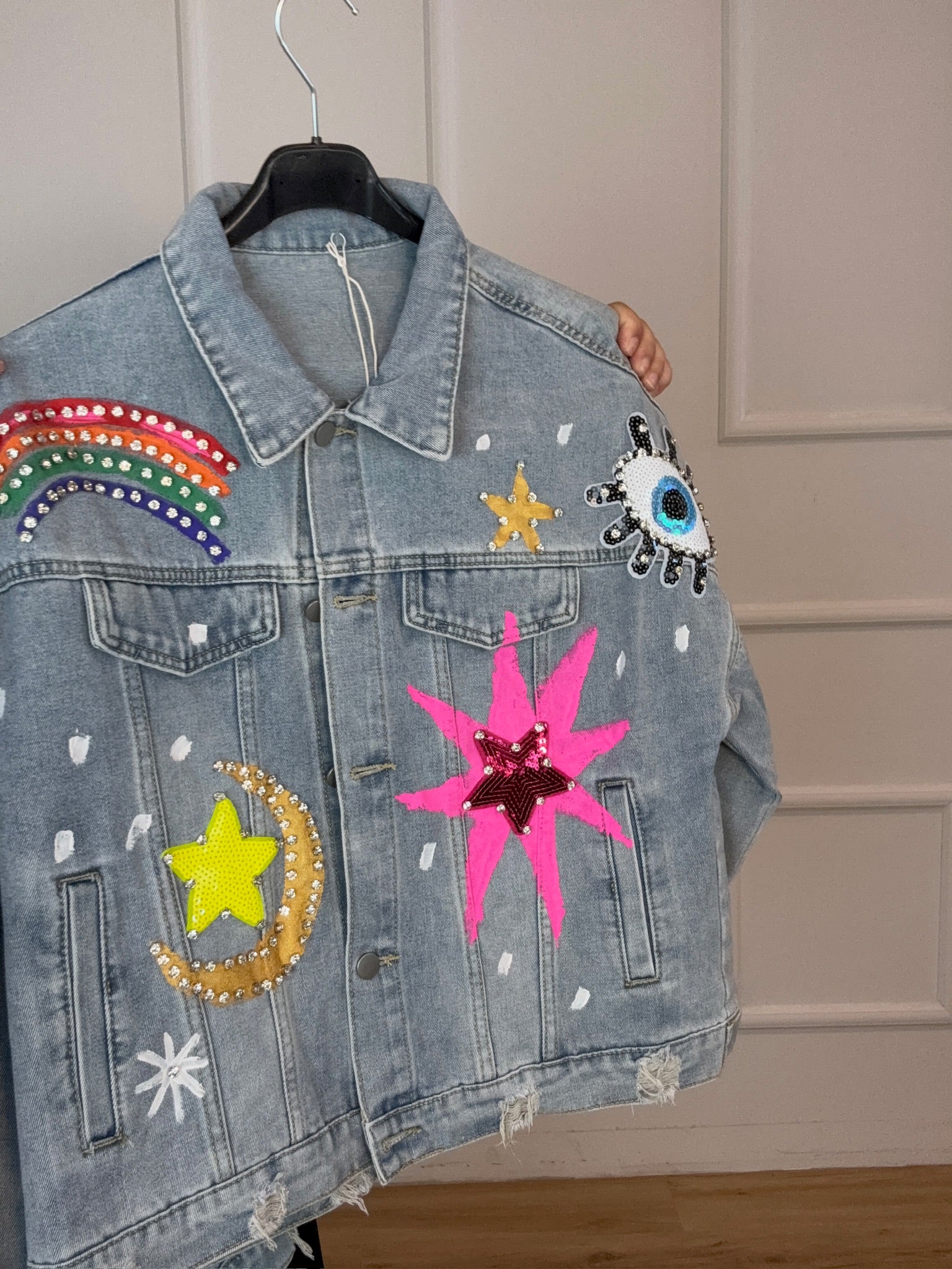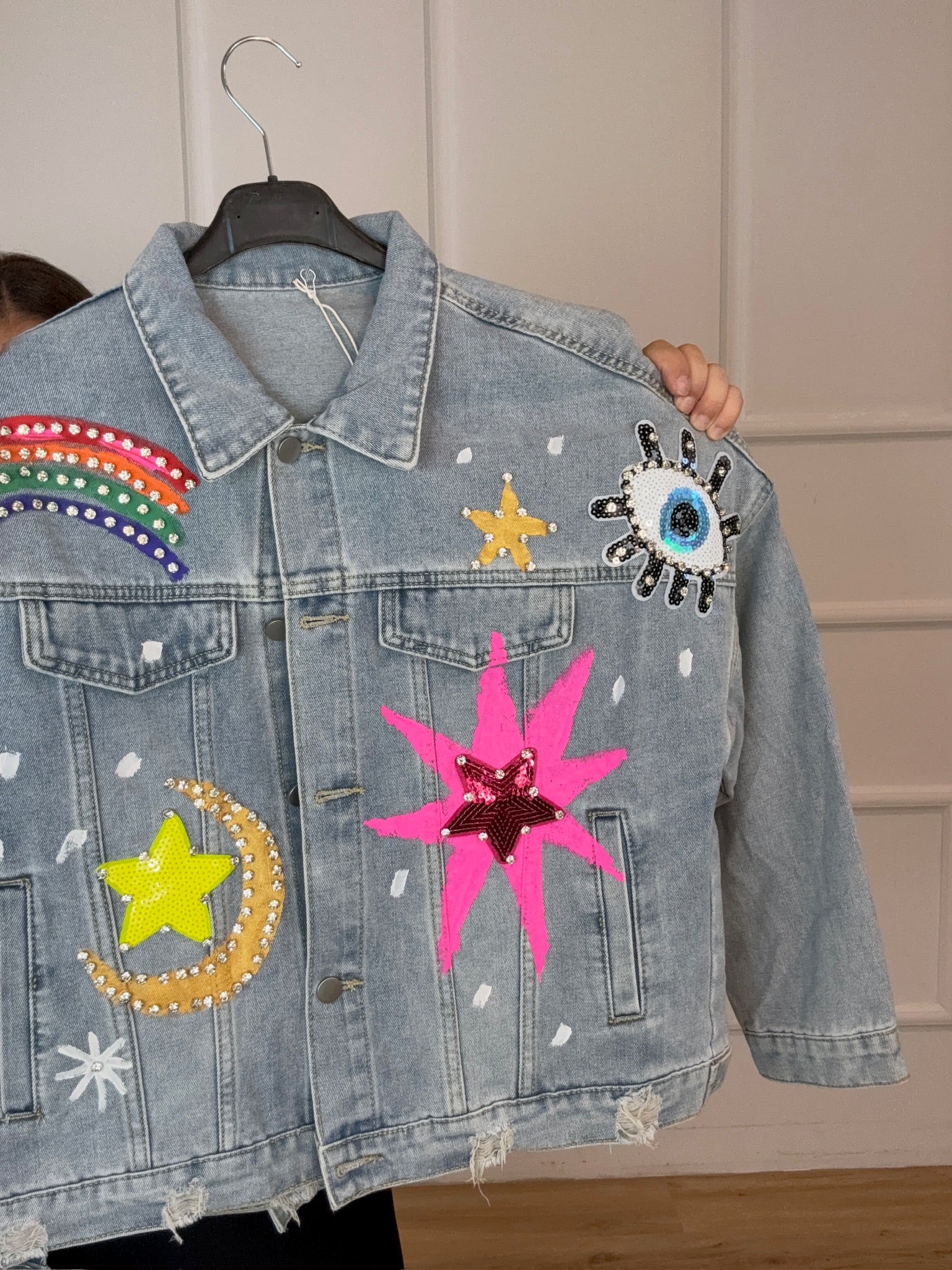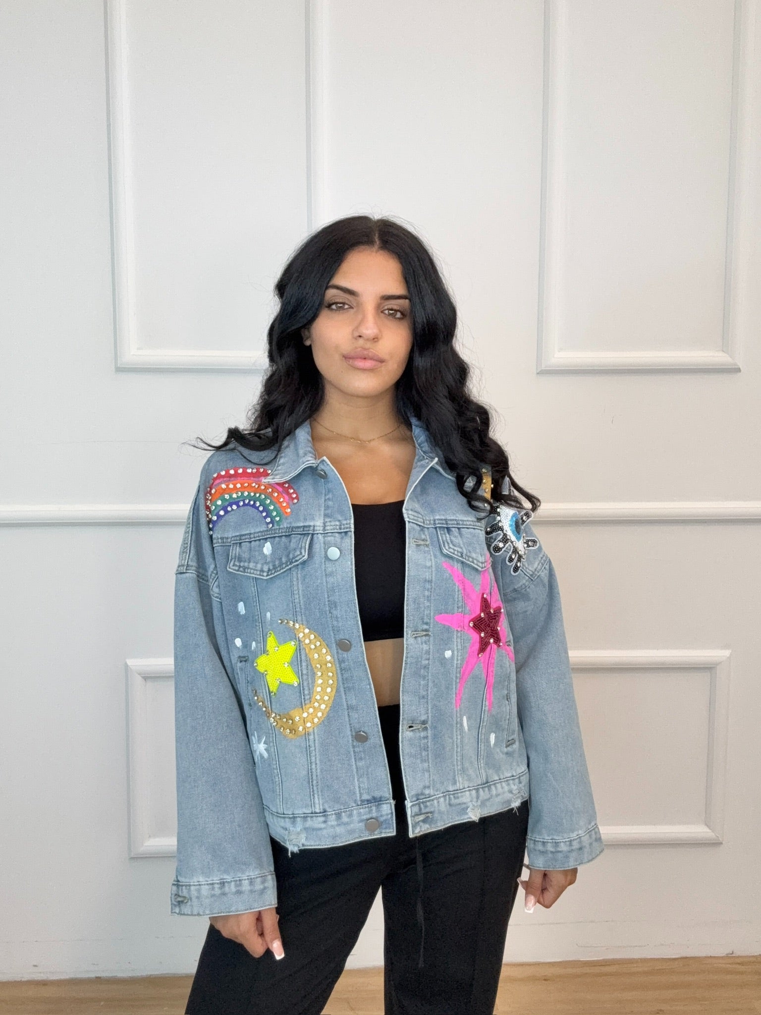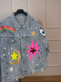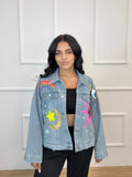 Talla Única (S–L). Color: Multicolor. Chaqueta vaquera con apliques y pedrería: arcoíris, estrellas y luna. Denim suave, corte relaxed, cierre de botones y bolsillos frontales. Aporta un toque divertido y brillante a tus looks casual.