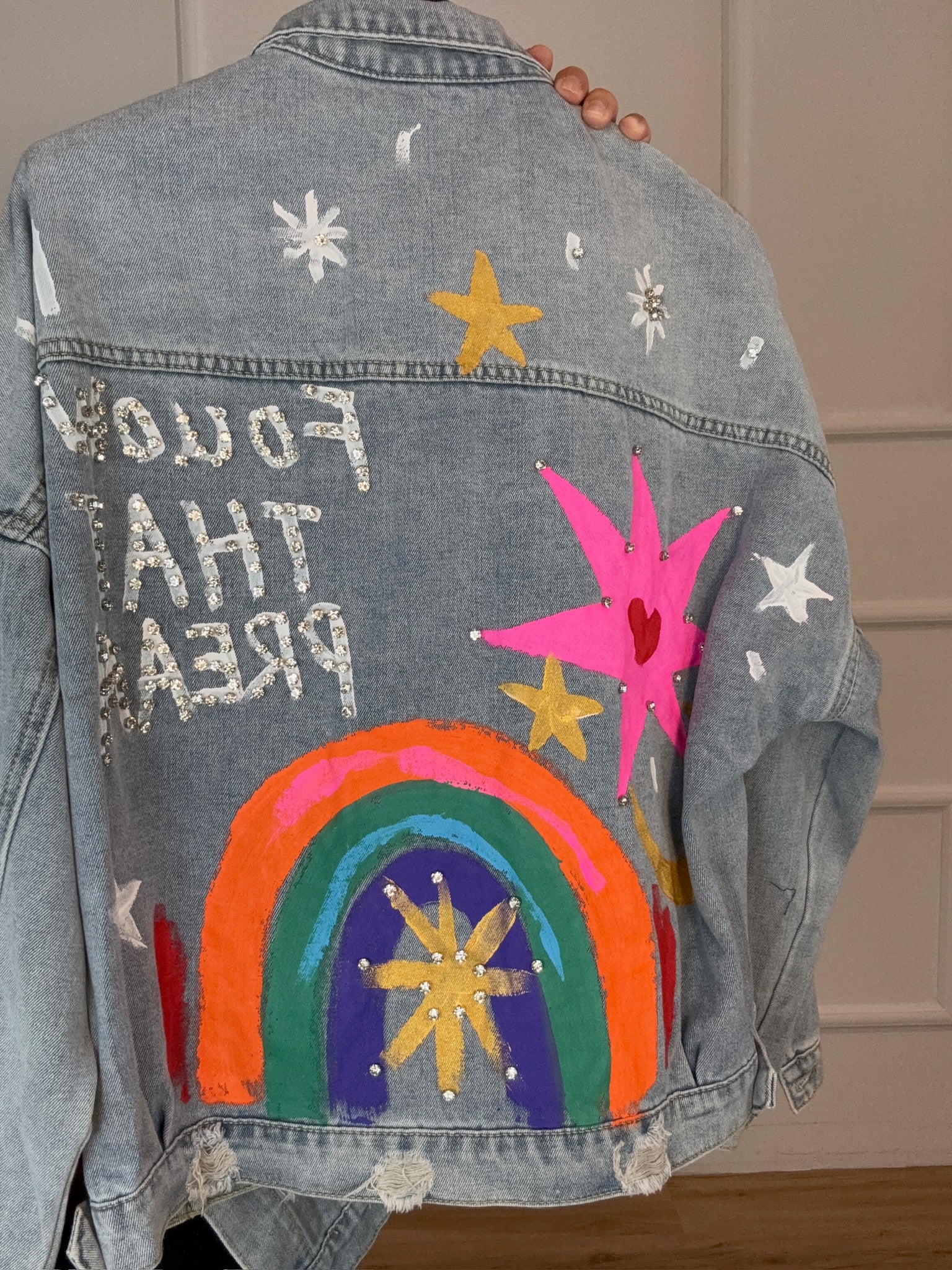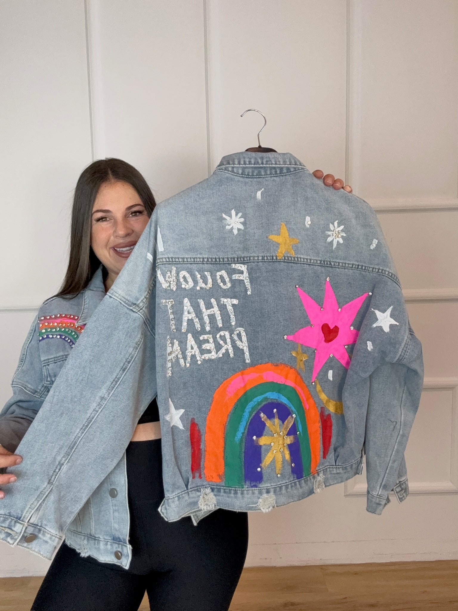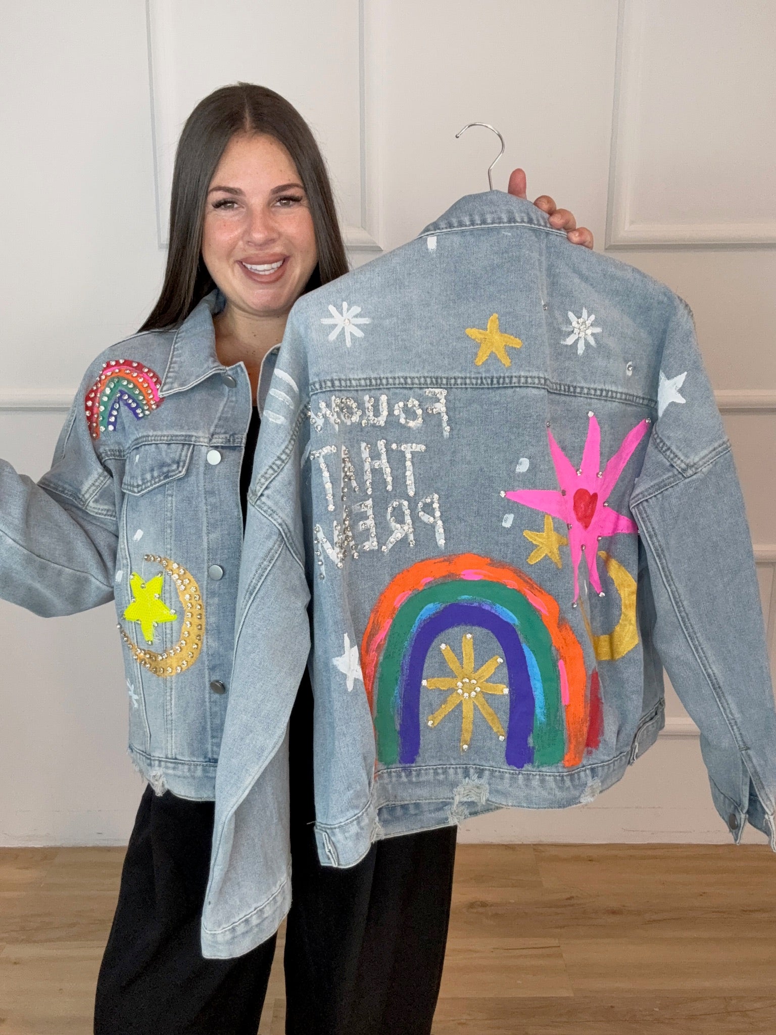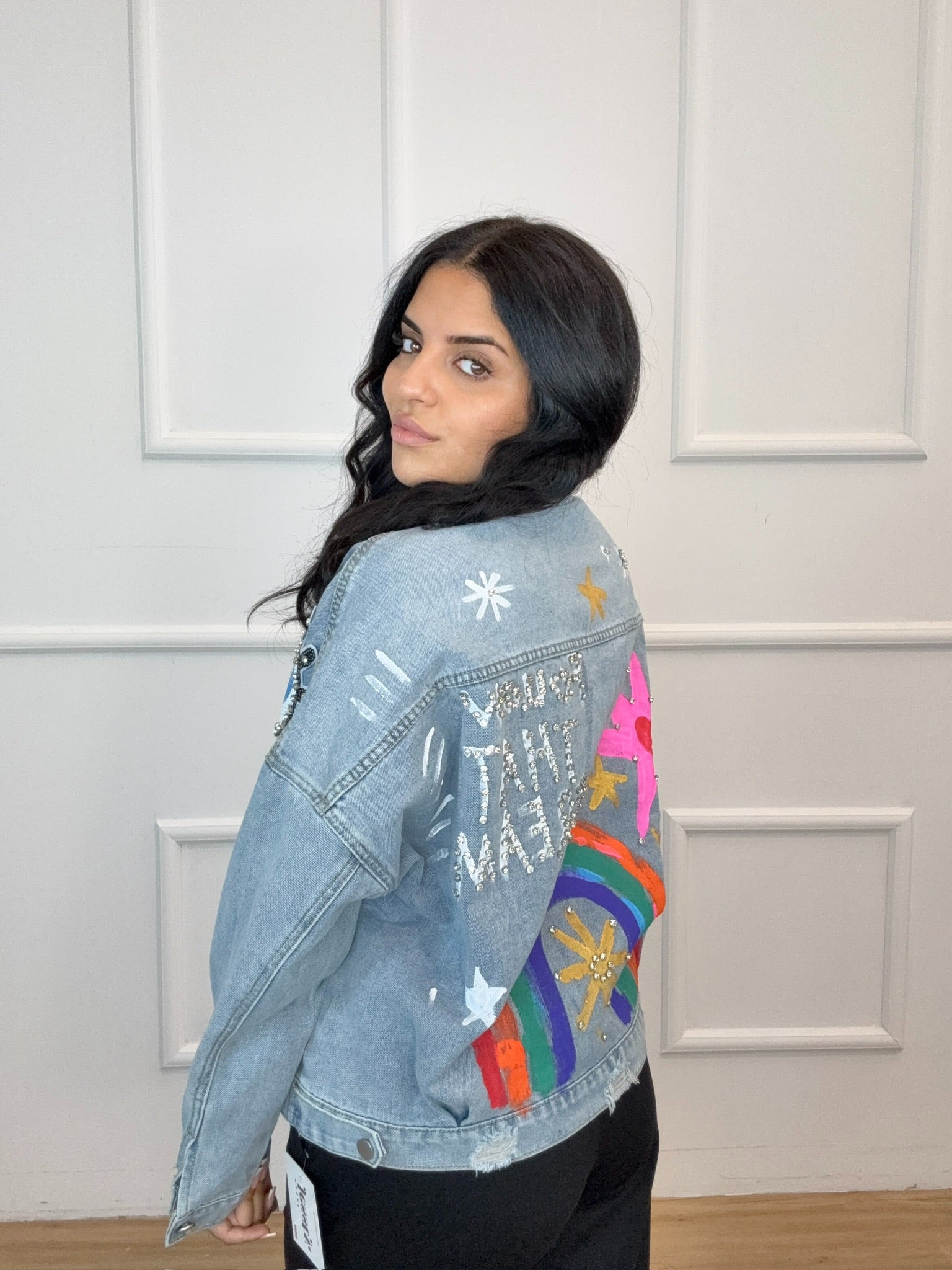 Talla Única (S–L). Color: Multicolor. Chaqueta vaquera con apliques y pedrería: arcoíris, estrellas y luna. Denim suave, corte relaxed, cierre de botones y bolsillos frontales. Aporta un toque divertido y brillante a tus looks casual.