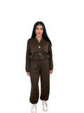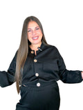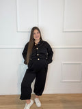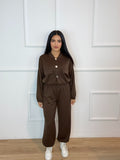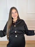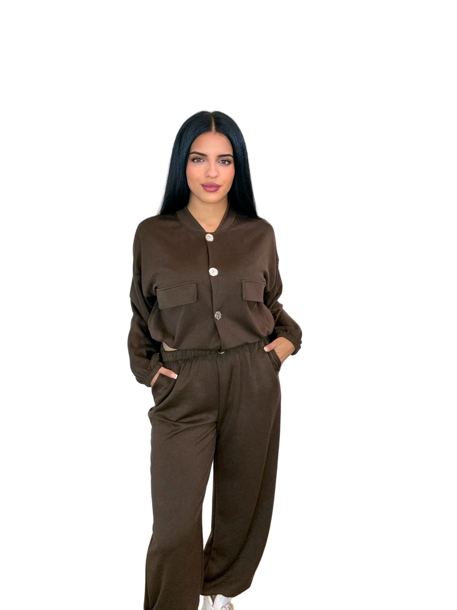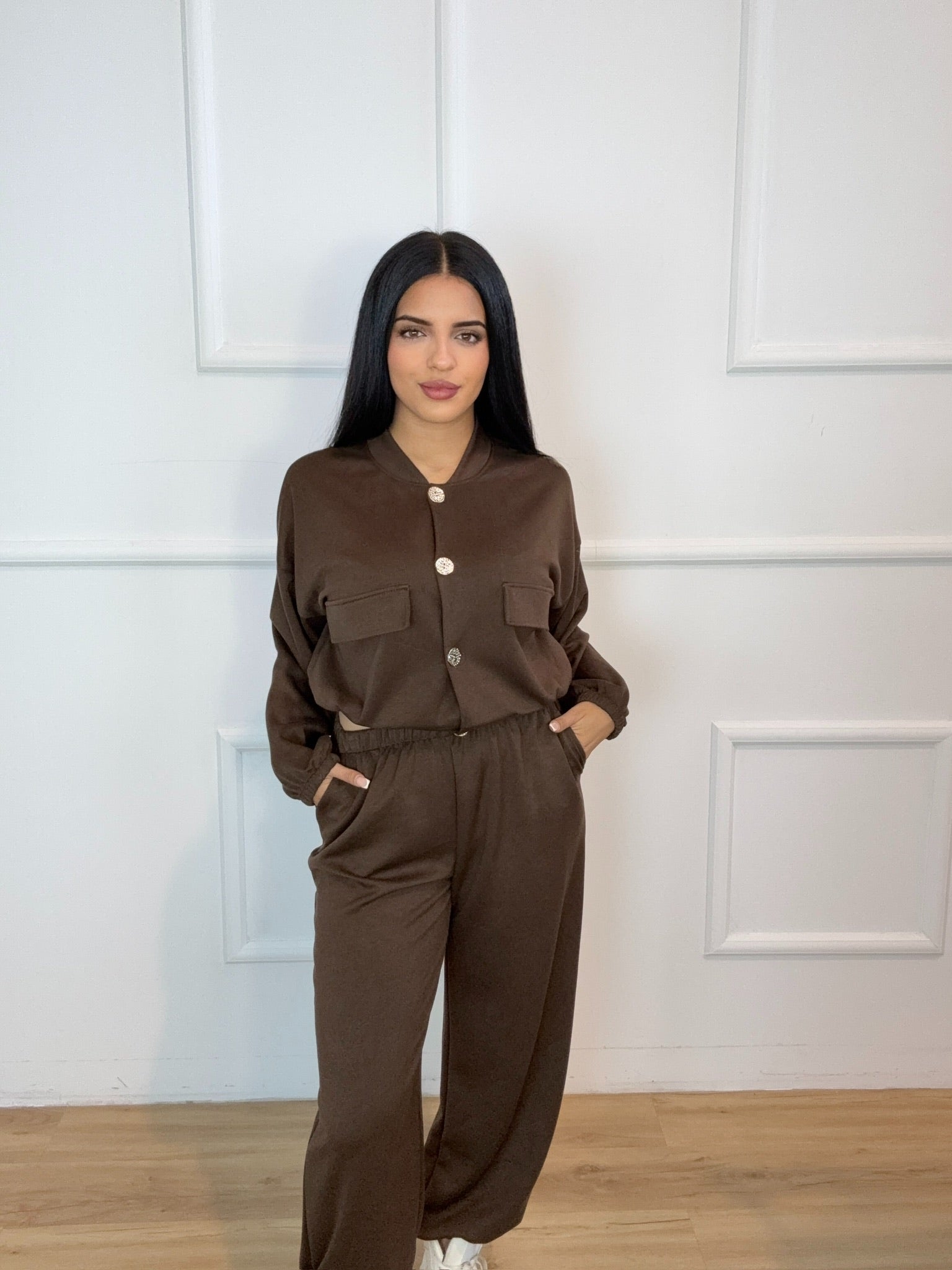 Talla única (S–XL). Colores: Negro y Marrón. Conjunto de 2 piezas: chaqueta ligera con botones joya y bolsillos frontales; pantalón jogger con cintura elástica y puño ajustado. Tejido suave y agradable, favorecedor y cómodo. Perfecto para looks casual-chic de diario.