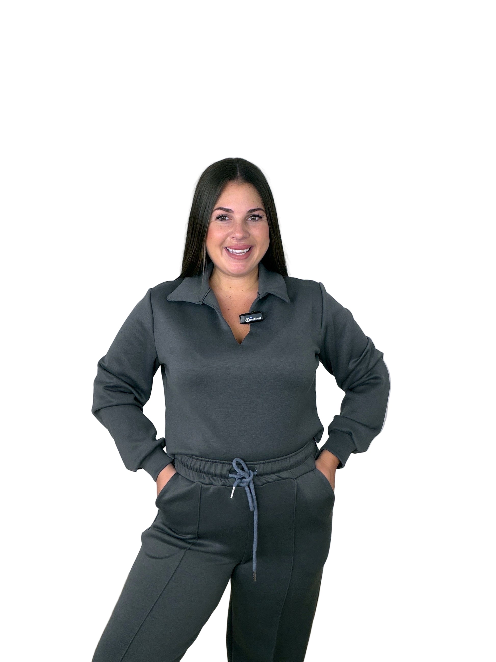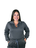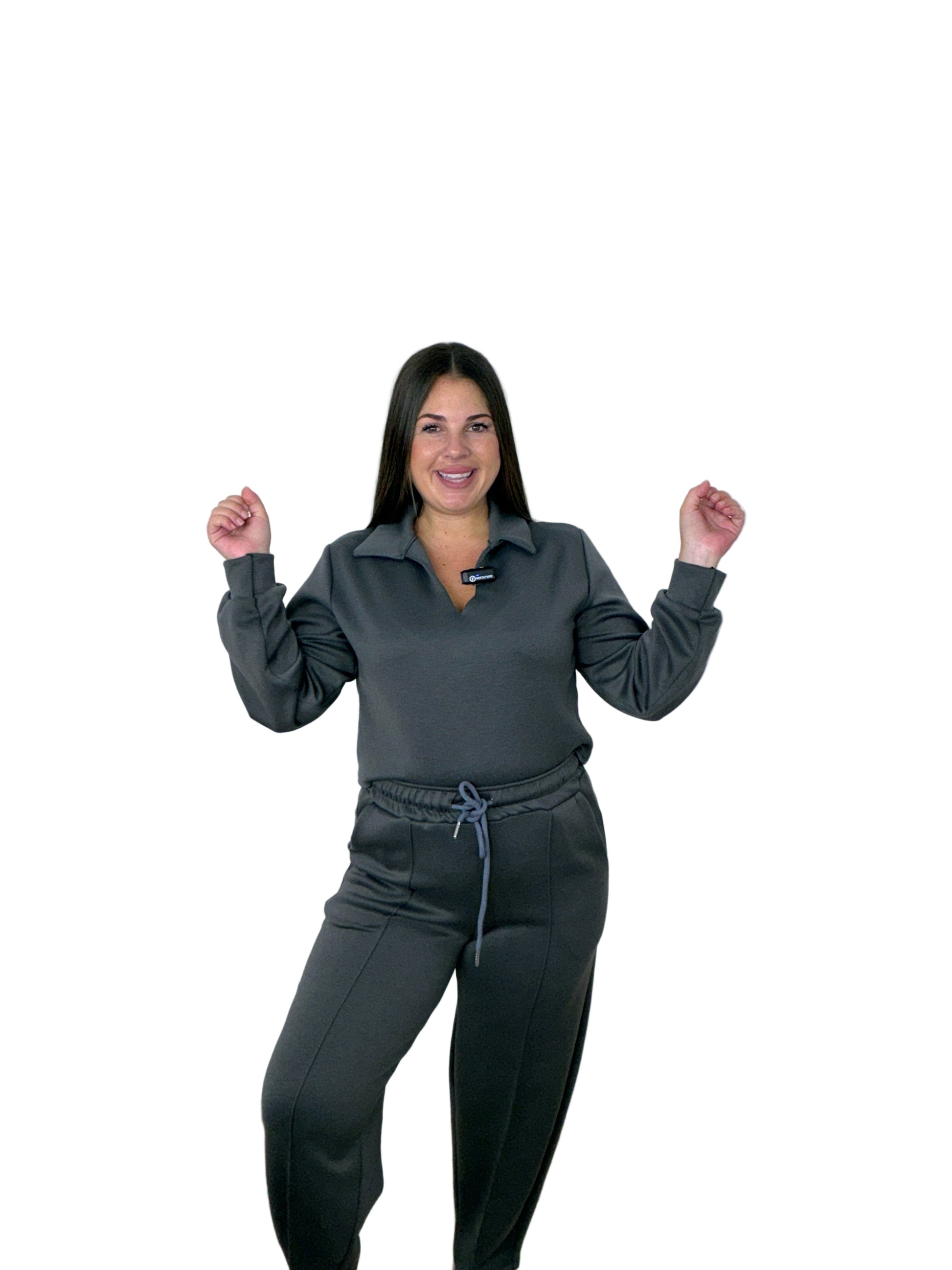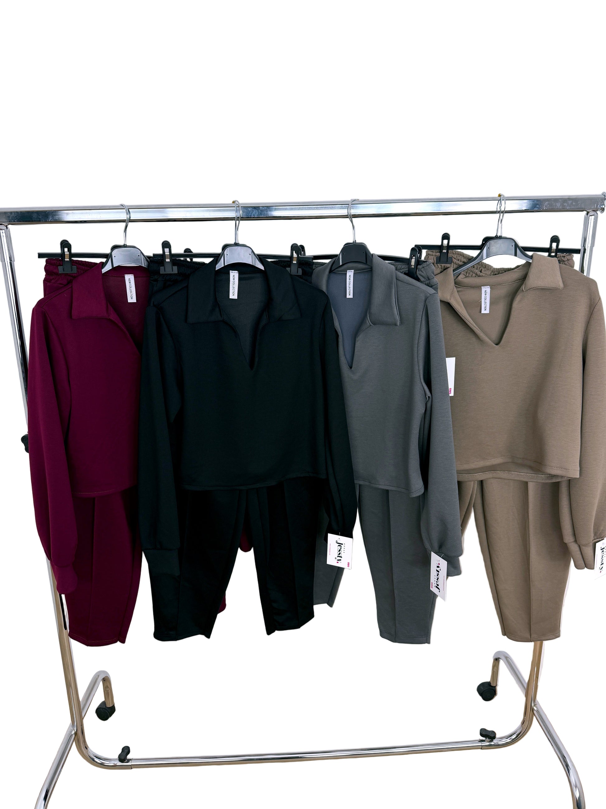 Talla única: da desde la S hasta la L. Colores: Negro, Camel, Gris y Burdeos. Conjunto de dos piezas con sudadera tipo polo y escote pico, y pantalón jogger de tiro medio con cintura elástica y cordón. Tejido suave y cómodo, de caída ligera. Perfecto para looks casuales o viajar; combínalo con zapatillas o botines.