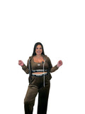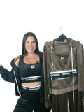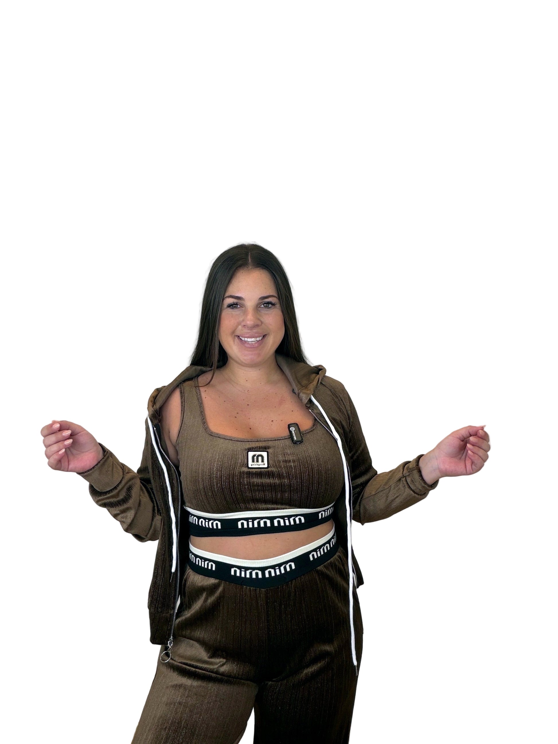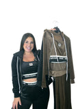 Conjunto Miu Top: tres piezas — chaqueta con capucha y cremallera, top elástico y pantalón fluido. Tejido canalé con ligero brillo, muy cómodo y adaptable. Cintura con goma ancha logotipada que sujeta sin apretar. Úsalo junto o por separado para un look sport-chic.