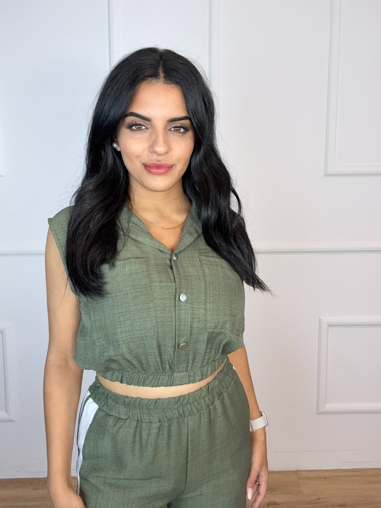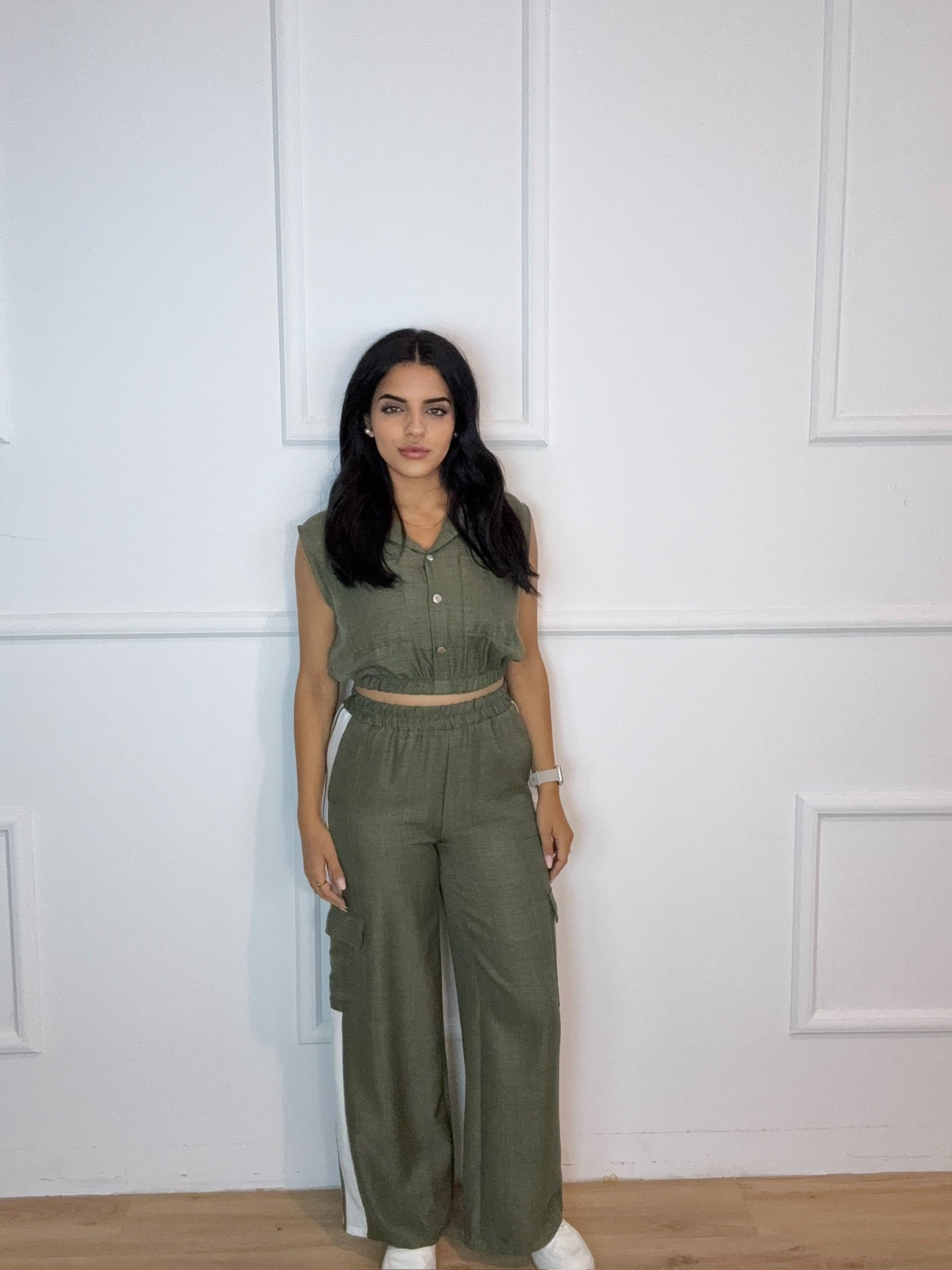 Dos piezas fresco y versátil en tejido efecto lino: top camisero corto sin mangas y pantalón de pernera amplia. Caída ligera y cintura elástica para estilizar sin apretar. Talla única con ajuste desde la S hasta la L.