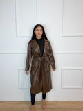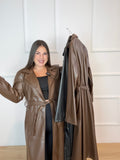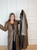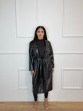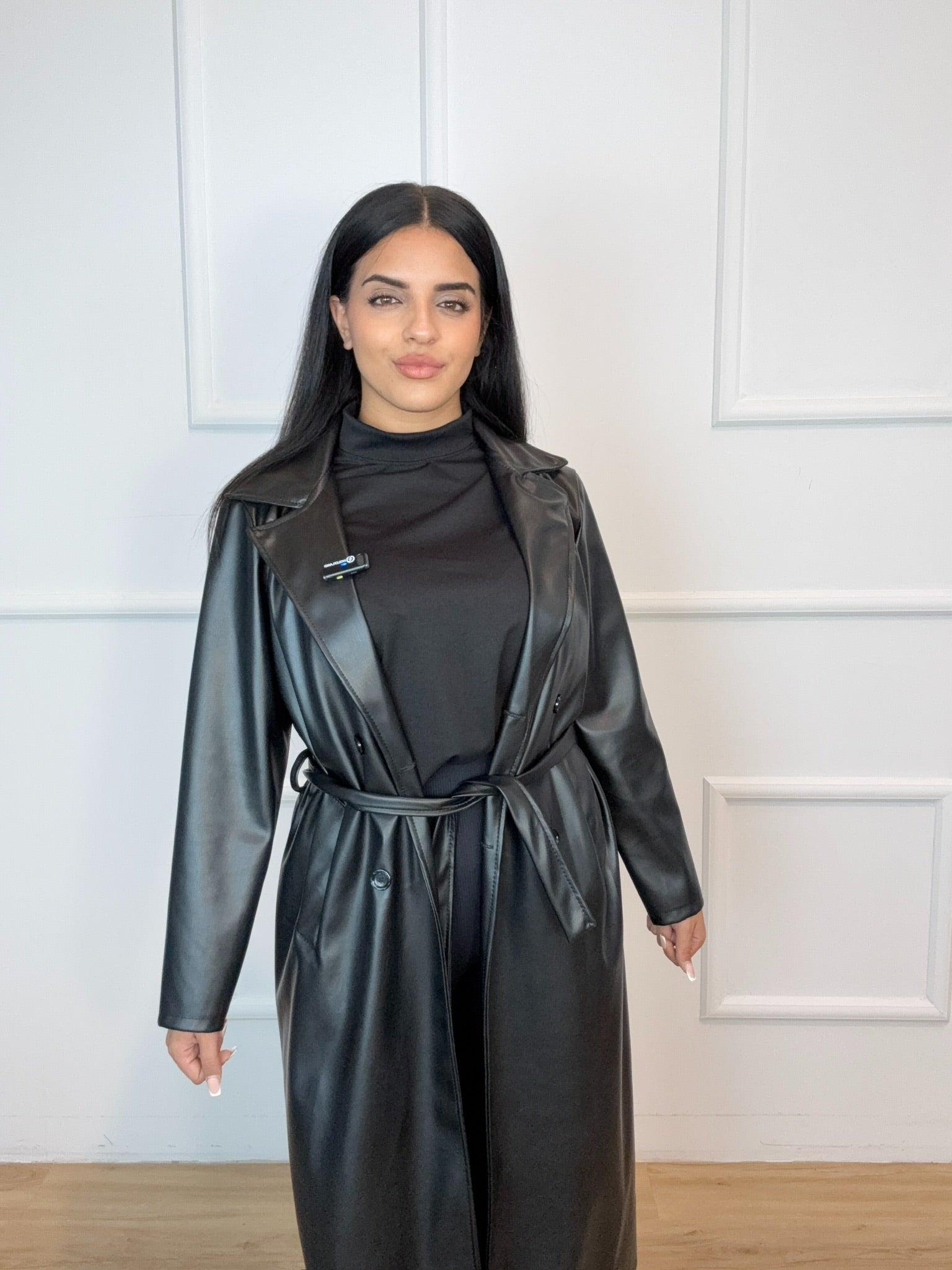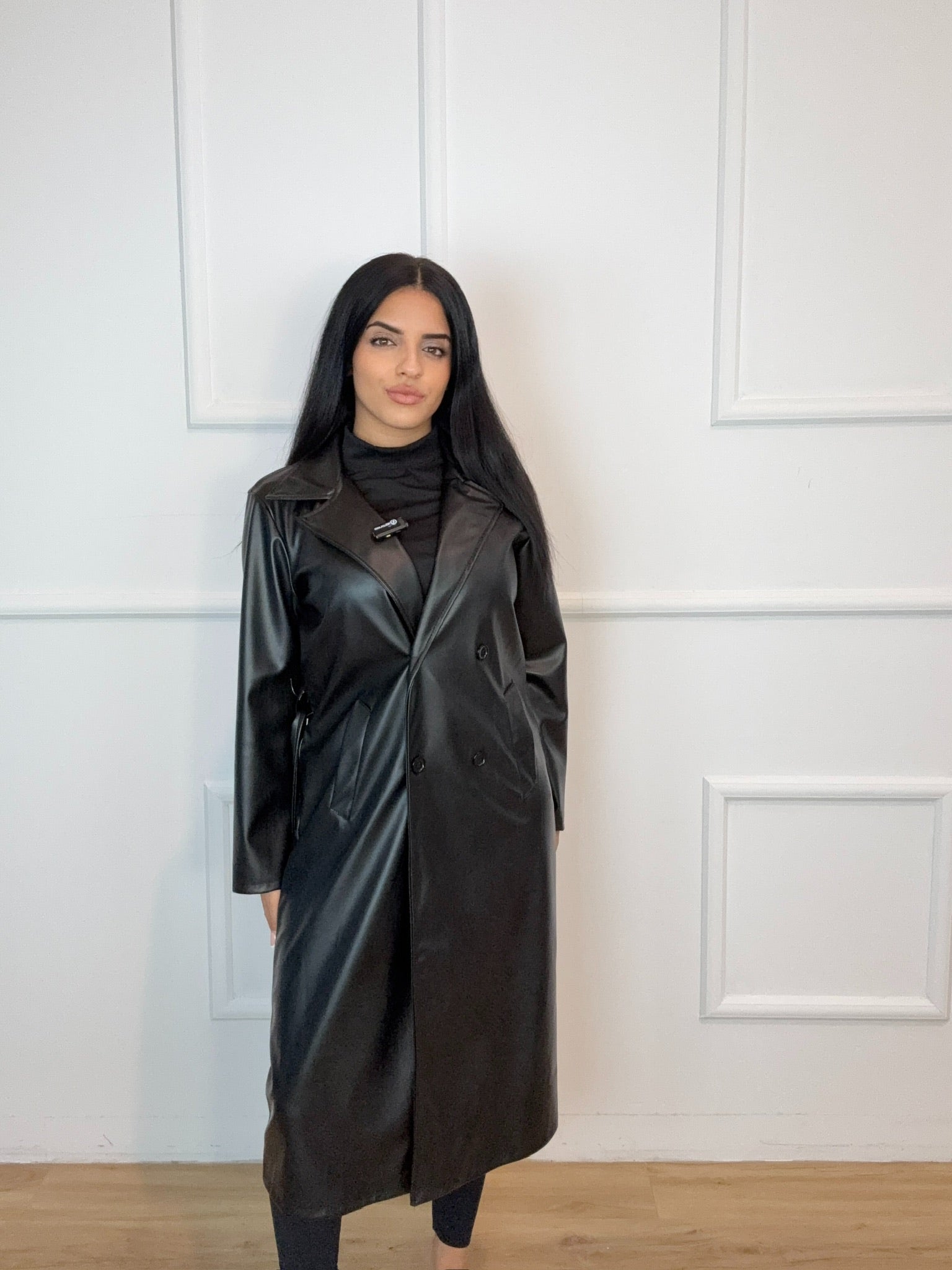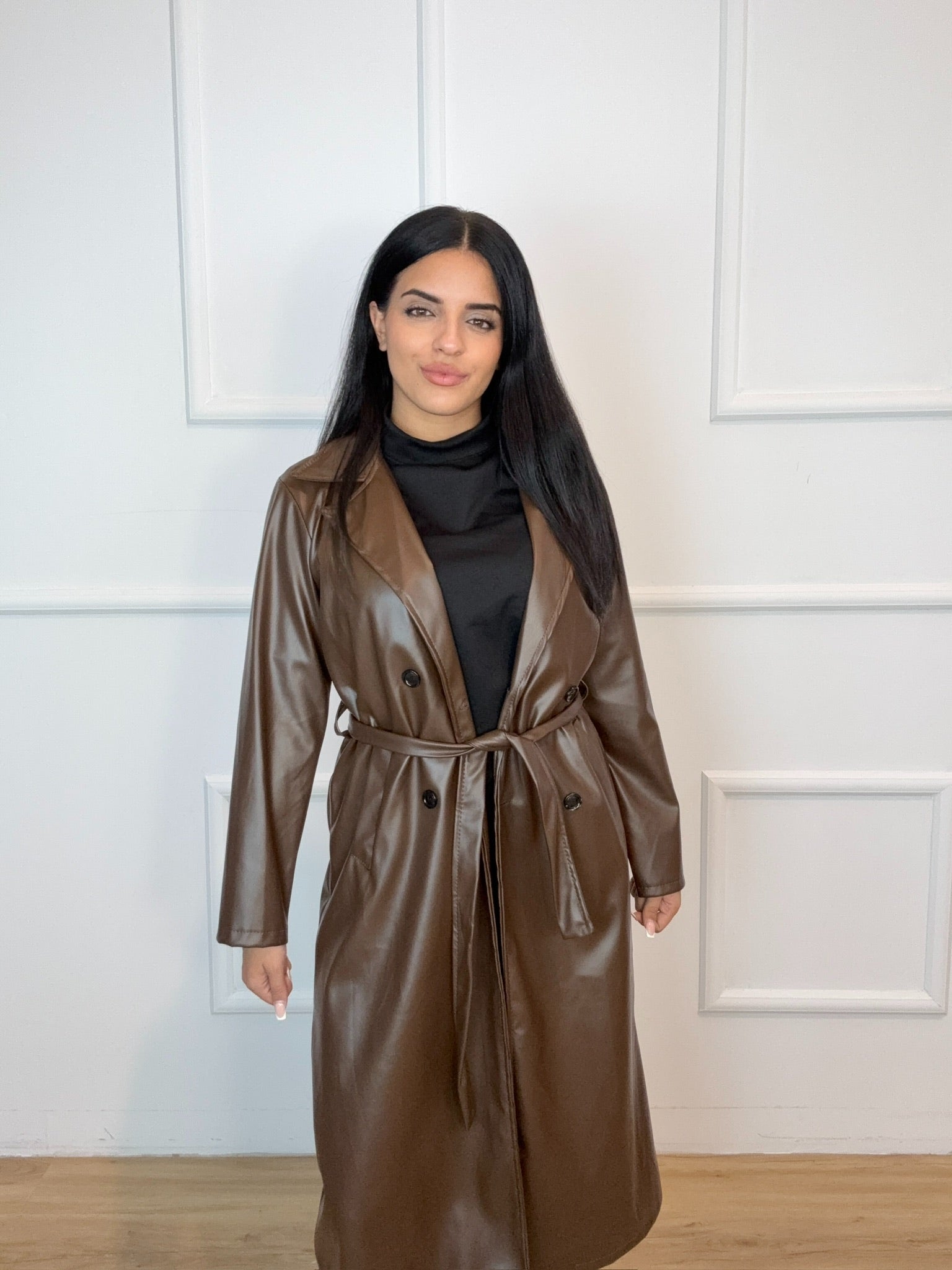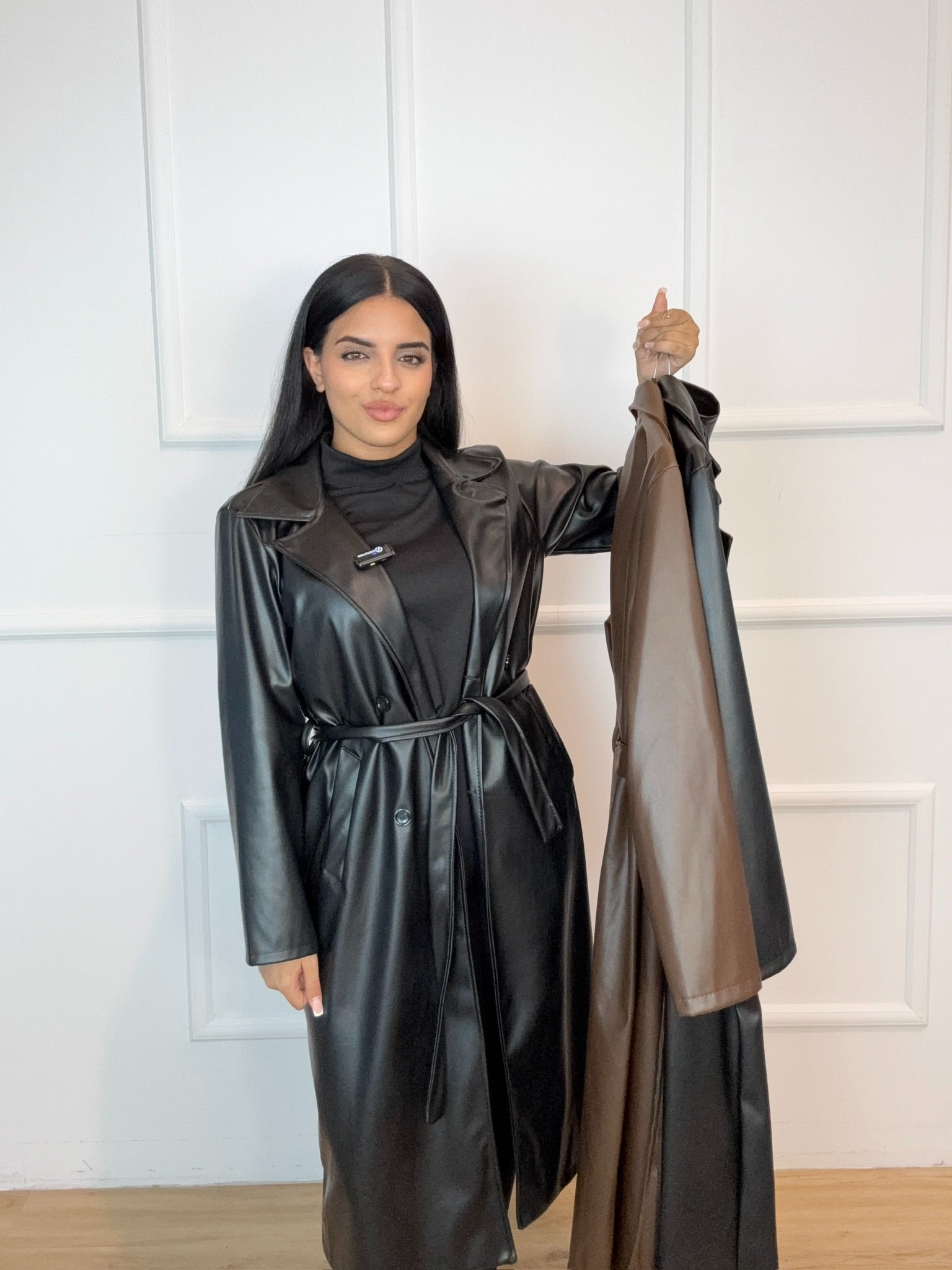 Talla única: da desde S hasta L. Colores: Negro y Marrón. Gabardina de polipiel con acabado efecto cuero, corte recto y largo midi. Cierre cruzado con botones y cinturón para ajustar la cintura. Solapas amplias y caída ligera, ideal para elevar looks casuales o de noche. Perfecta para entretiempo.
