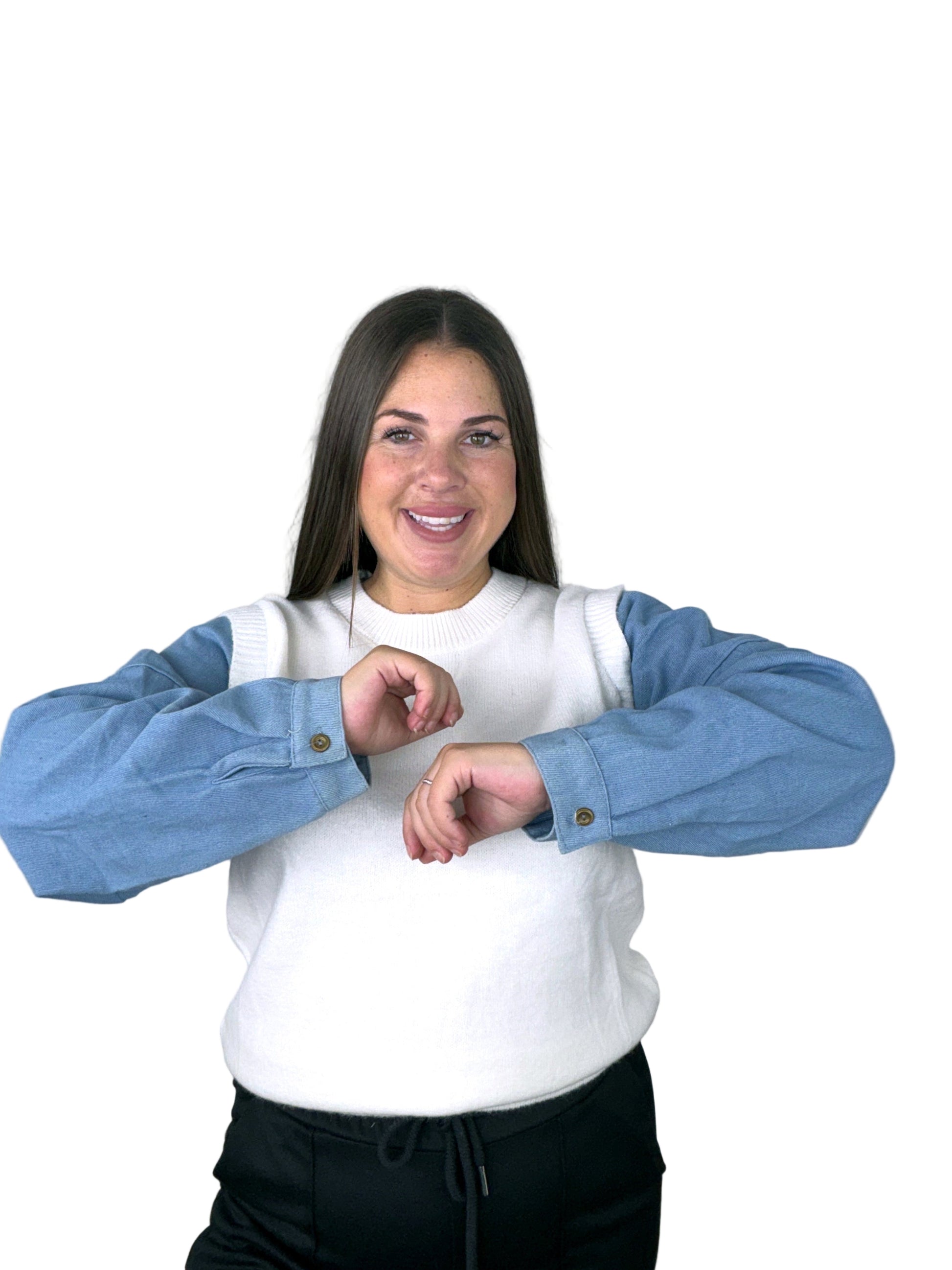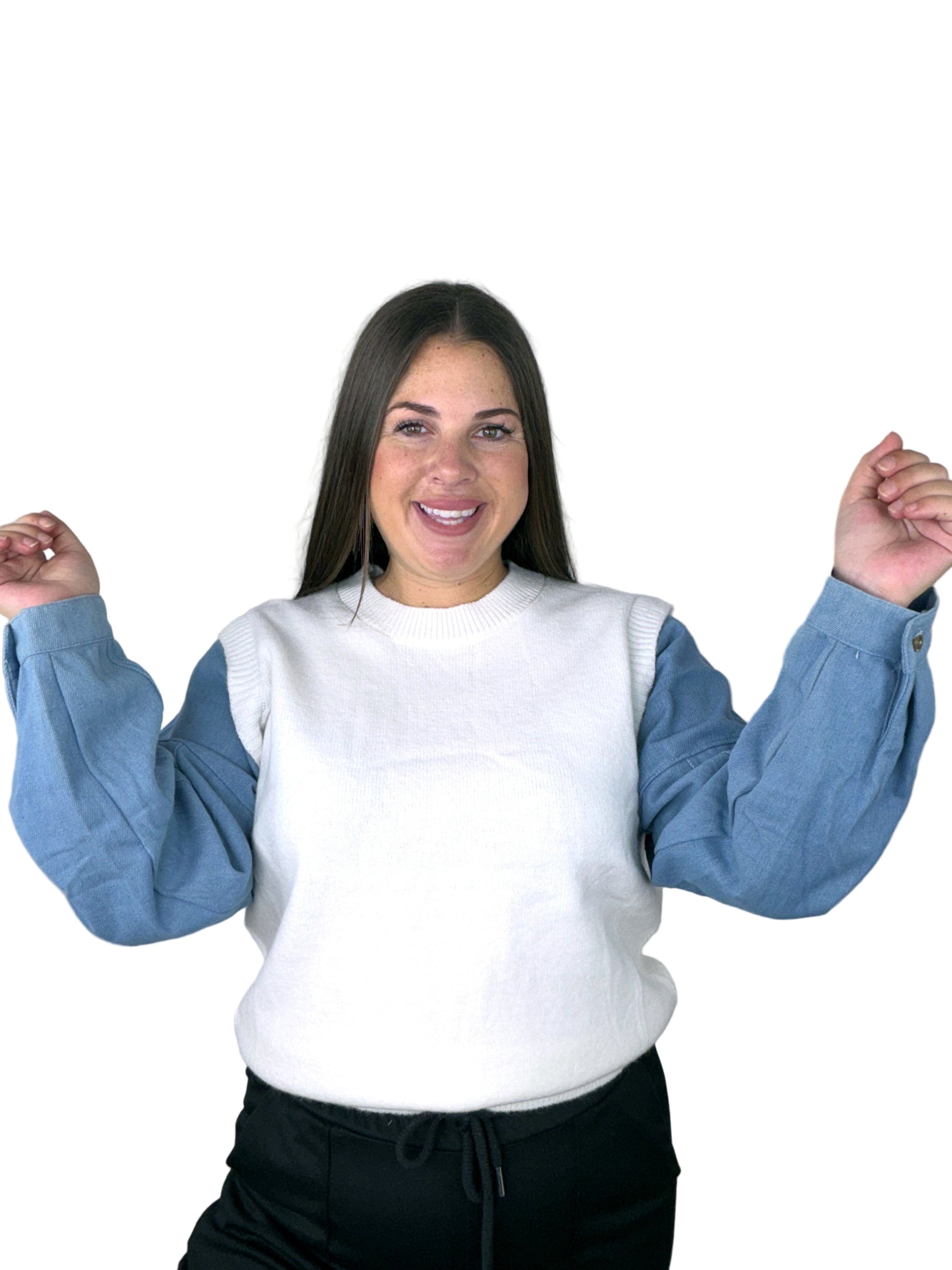 Color: cuerpo blanco con mangas denim azul.