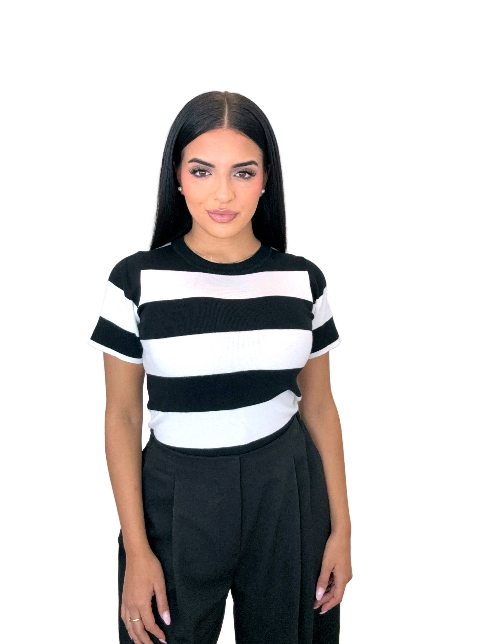 Jersey de punto suave con rayas anchas, cuello redondo y manga corta. Tejido elástico que se adapta sin marcar, largo estándar y caída recta. Versátil para looks casual o de oficina; combina genial con vaquero o sastre.