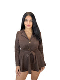 Talla única: da desde la S hasta la L. Color: marrón. Mono estilo blazer con solapa y botones dorados, tejido suave efecto ante. Cinturón a lazo para ceñir la cintura y bajo con vuelo tipo falda-pantalón. Manga larga, corte corto y favorecedor. Ideal para looks de día o noche.