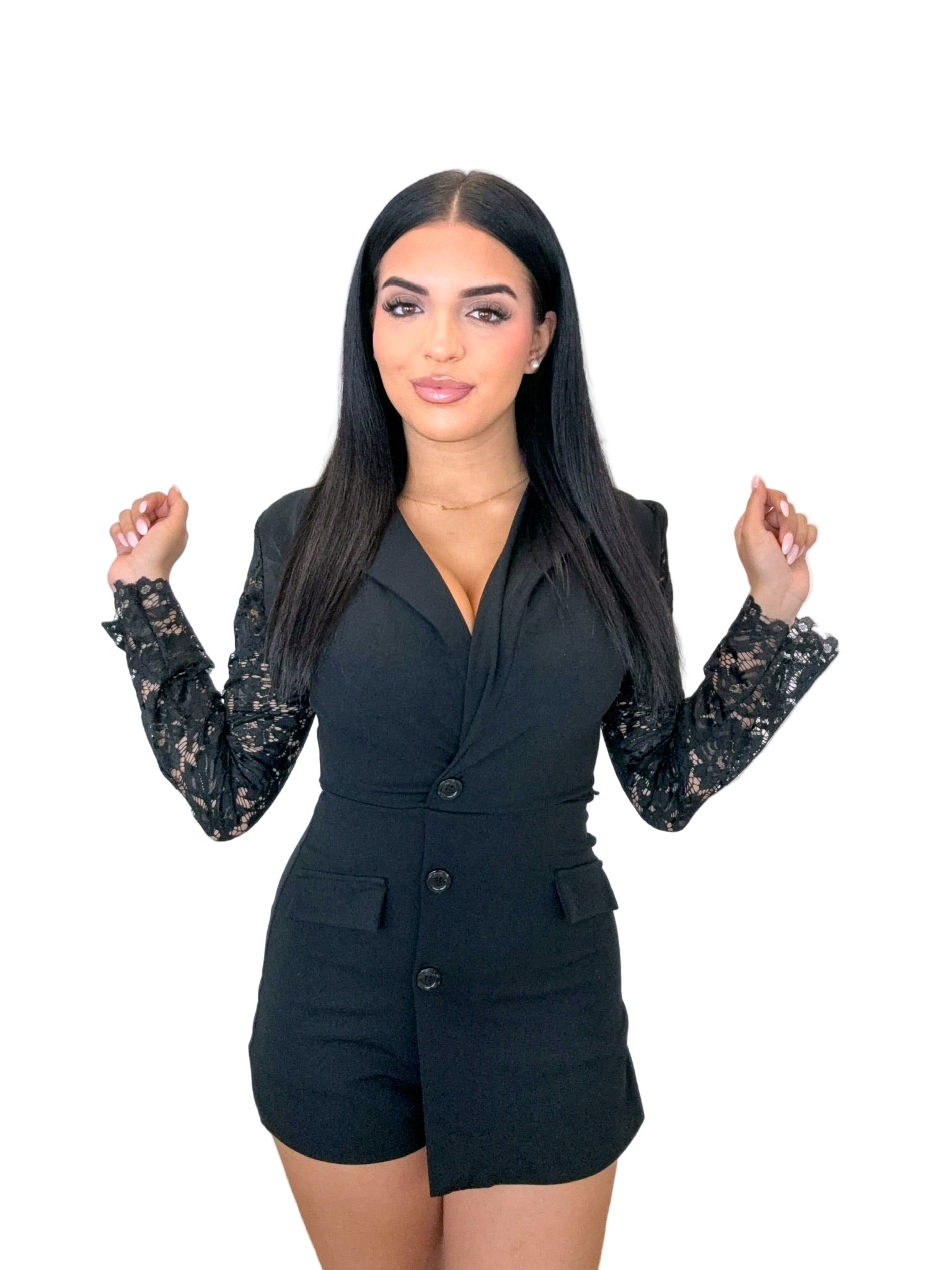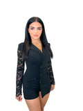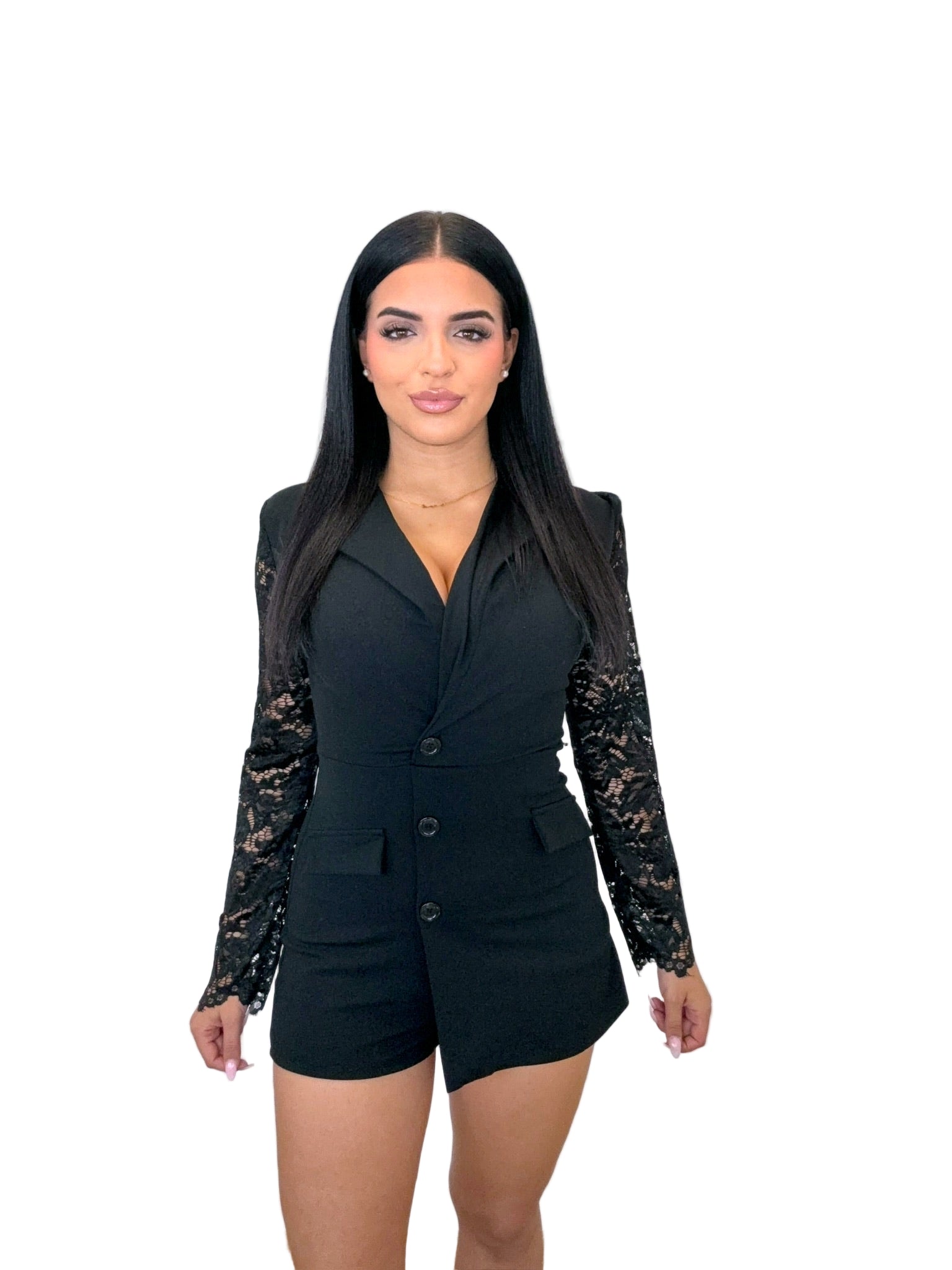 Talla Única (da de S a L). Color: Negro. Mono Murcia corto estilo blazer con mangas de encaje, solapa cruzada y cierre de botones. Tejido con caída y ligera elasticidad para un ajuste cómodo. Bolsillos decorativos. Ideal para looks de noche y eventos.