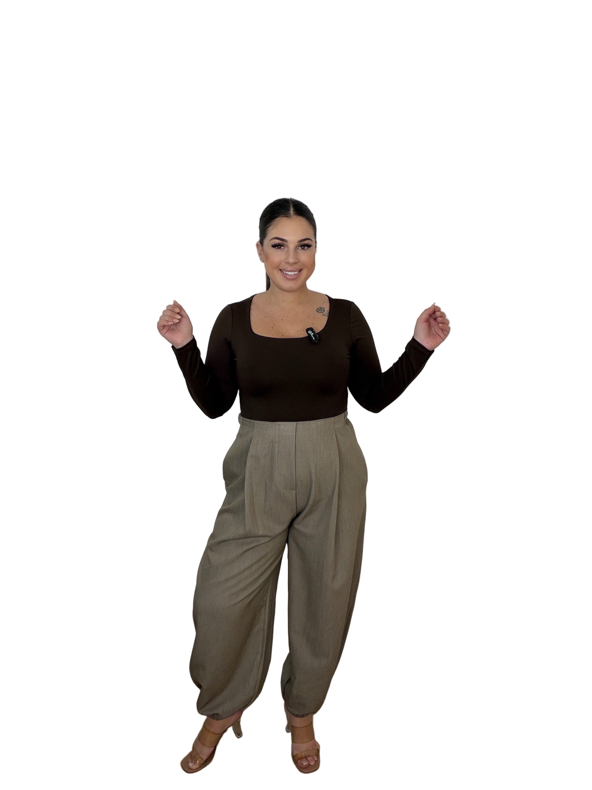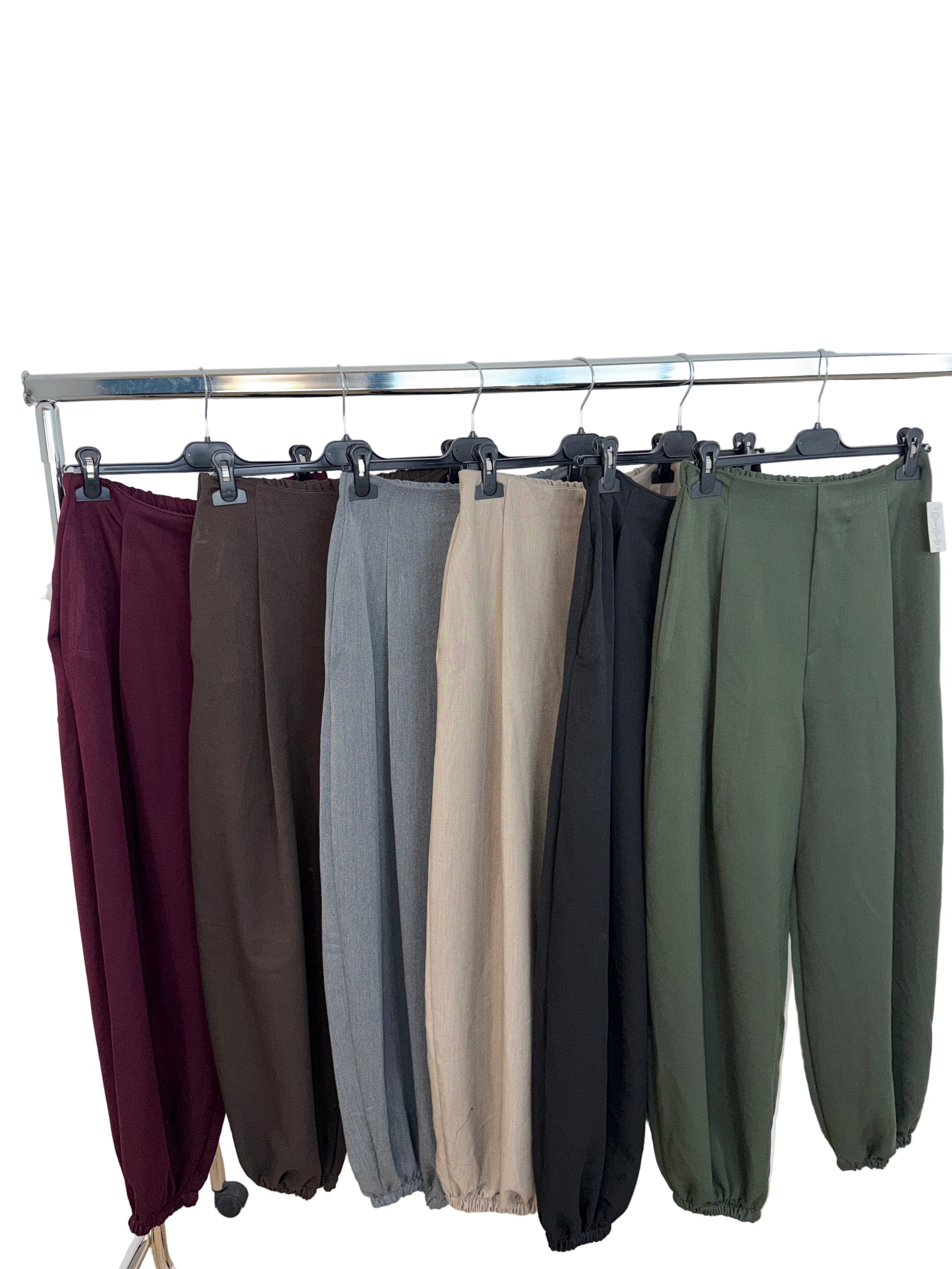 Talla Única: da de S a L. Colores: Blanco, Negro, Verde, Burdeos, Gris y Beige. Pantalón Lisboa de tejido fluido, pernera amplia y bajo con goma para un ajuste cómodo. Cintura flexible con efecto pinza frontal que estiliza. Perfecto para looks casual o de oficina.