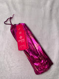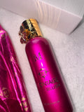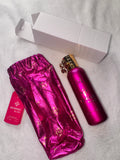Presentación: frasco fucsia con tapón dorado y adorno floral; incluye funda textil metalizada a juego y caja protectora.