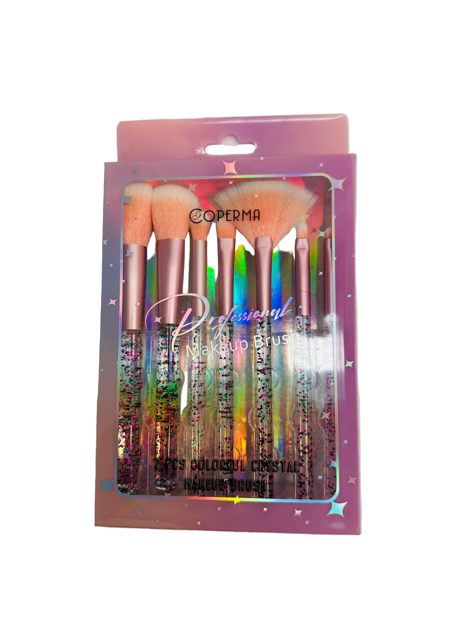 El Set Brochas Top COPERMA es el imprescindible de cualquier amante del maquillaje que quiere conseguir resultados de estudio en casa. Este set incluye siete brochas con mango efecto cristal, llenos de destellos multicolor y acabado holográfico, que no solo son súper prácticos, sino también preciosos para decorar tu tocador. Las cerdas ultrasuaves, en degradado coral-rosa, están diseñadas para difuminar y aplicar productos en polvo, crema o líquido con precisión y suavidad.