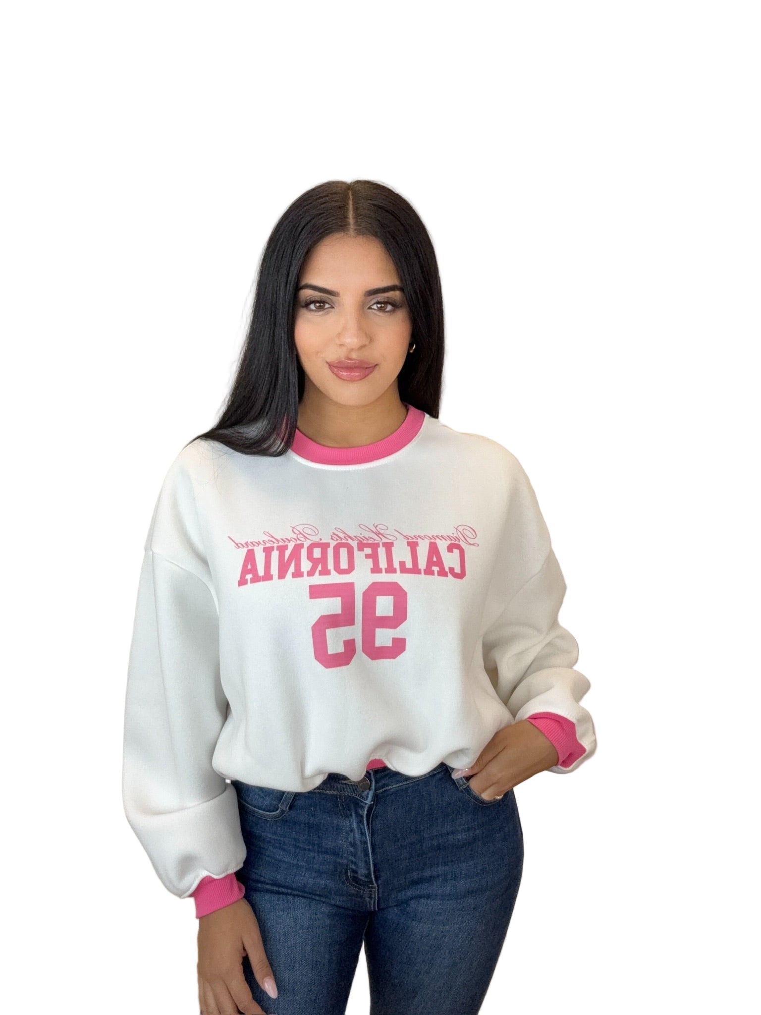 Tallaje: Talla Única, da desde la S hasta la L. Colores: blanco con detalles rosa. Sudadera California de tacto suave e interior afelpado, cuello redondo y puños a contraste. Corte relajado y cómodo; perfecta para looks casuales con vaqueros o leggings. Estampado frontal estilo sporty.