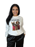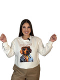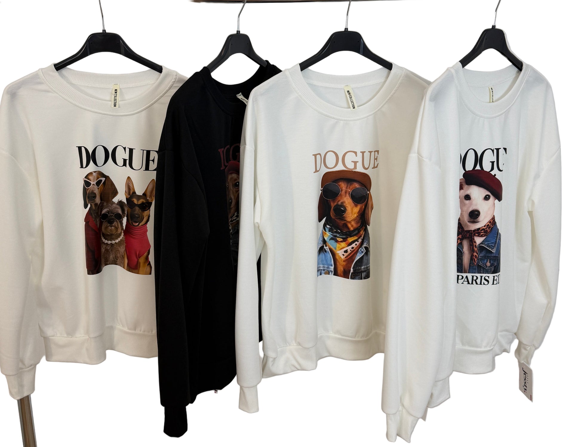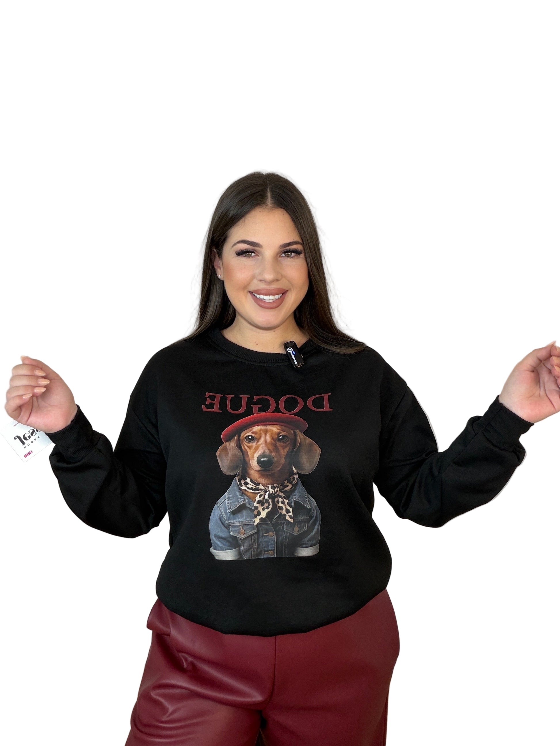 Talla Única: da desde la S hasta la L. Colores: Negro y Burdeos; Blanco y Beige; Blanco y Negro (un perro) y (tres perros). Sudadera suave con interior afelpado, cuello redondo y puños/cintura elásticos. Estampado dog lover y corte cómodo. Perfecta para vaqueros o leggings: estilo casual con toque divertido.