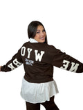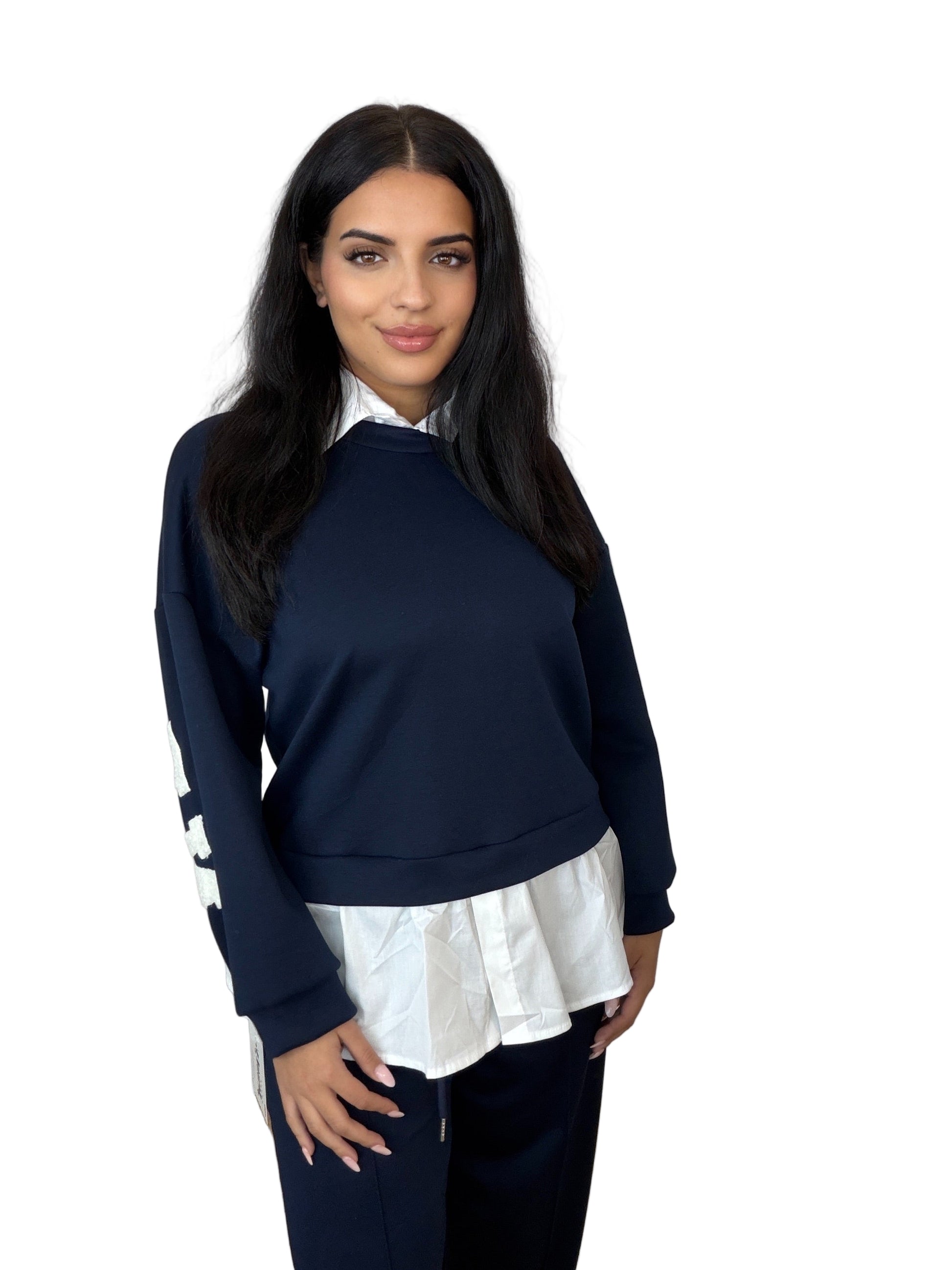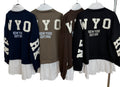 Talla Única (da S–L). Colores: Negro, Azul marino, Camel y Marrón. Sudadera estilo 2 en 1 con bajo efecto camisa y letras “NY” en mangas y pecho. Tejido suave y cómodo, cuello redondo y puños elásticos. Ideal con vaqueros o leggins para un look casual urbano.