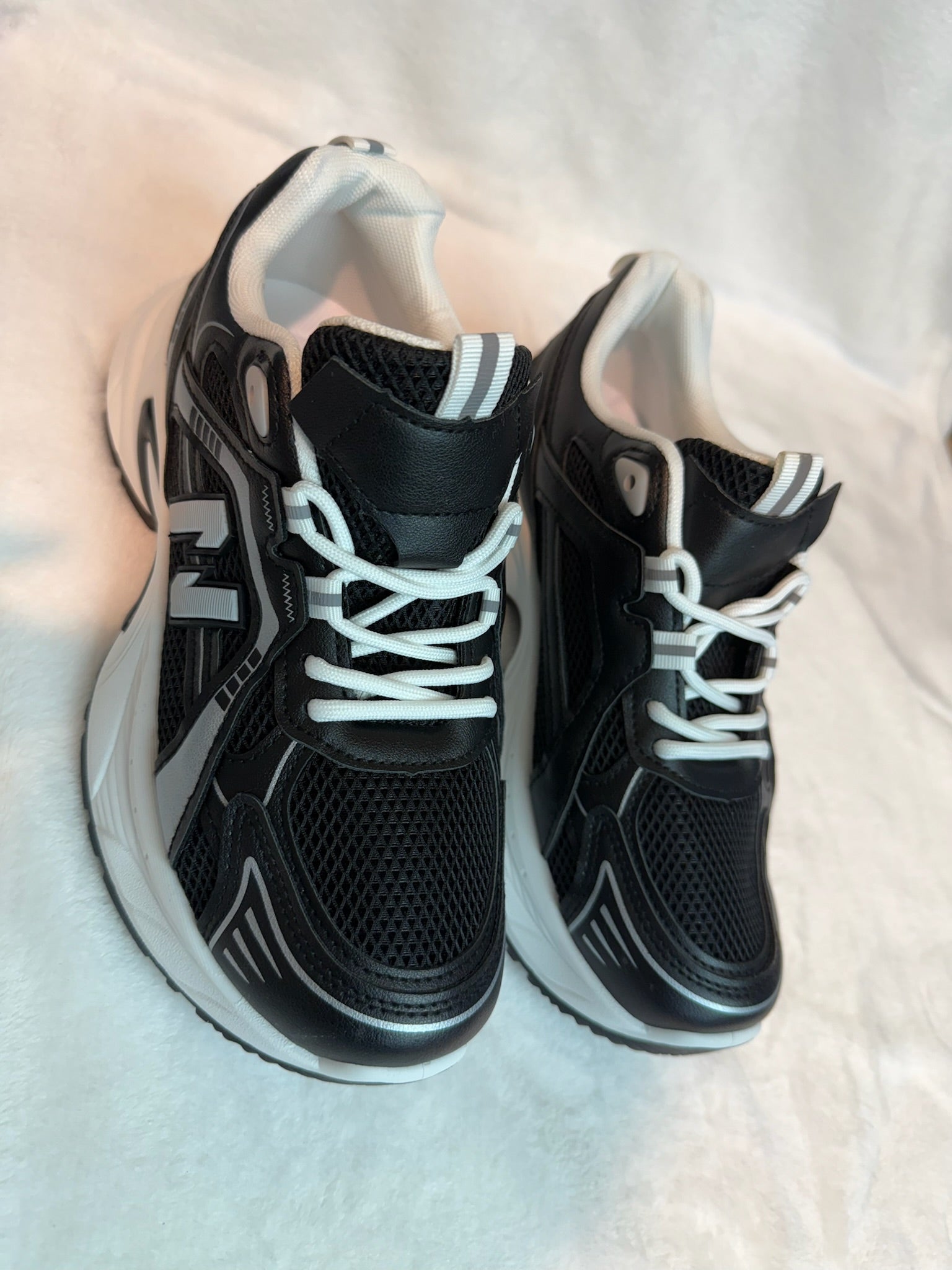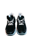 Tallas: 37 y 38. Colores: negro con detalles blancos y plateados. Zapatilla tipo running con malla transpirable y refuerzos sintéticos. Suela chunky con buena amortiguación y agarre. Cierre de cordones. Ligera y cómoda para tu día a día, perfecta para looks casual o sport.