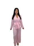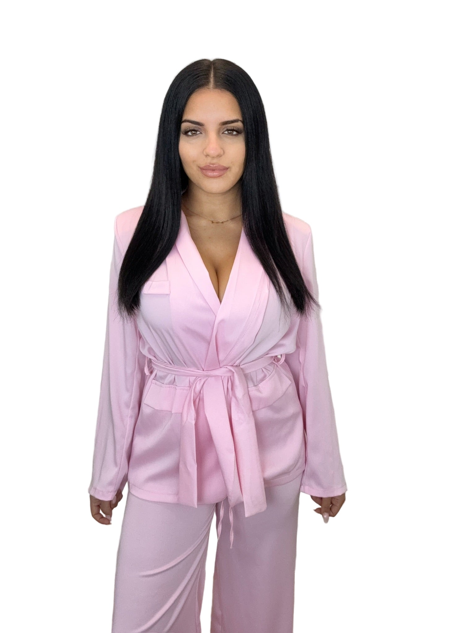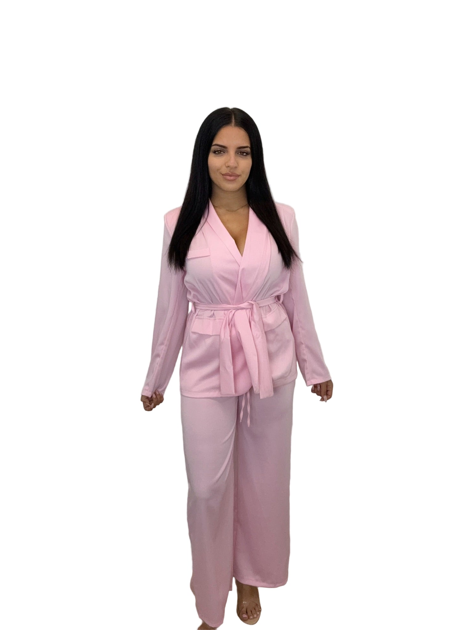 Talla única: S–L. Color: rosa. Conjunto de dos piezas: americana cruzada con solapa y cinturón ajustable, bolsillos frontales; pantalón recto de tiro medio. Tejido suave y fluido para una caída elegante y cómoda. Ideal para eventos o look de oficina.