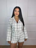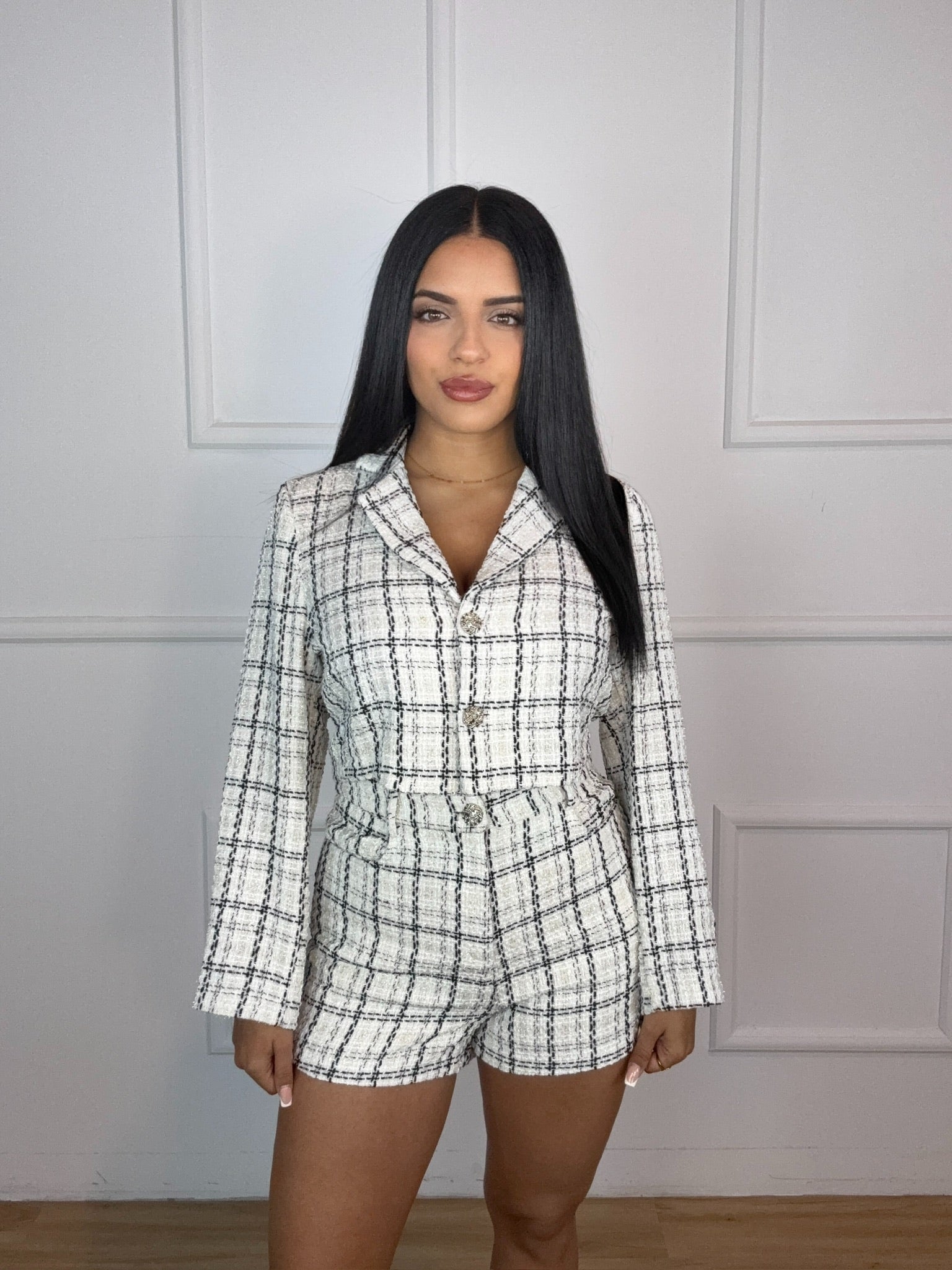 Inspirado en la sastrería británica, este conjunto de americana + short en tejido tipo tweed con cuadro ventana eleva cualquier look sin perder comodidad. La chaqueta de líneas limpias aporta estructura y el short de tiro alto define la cintura para un efecto femenino y actual.