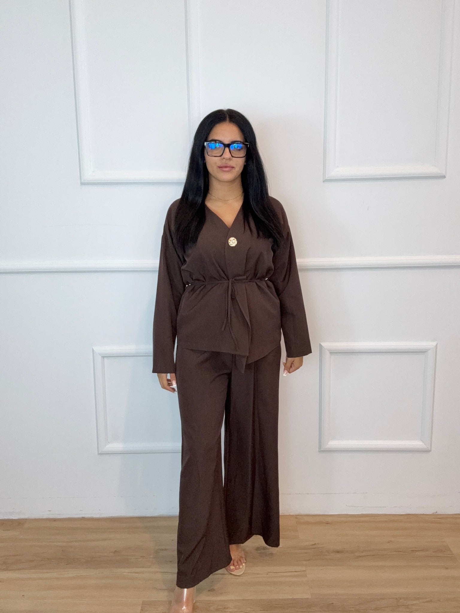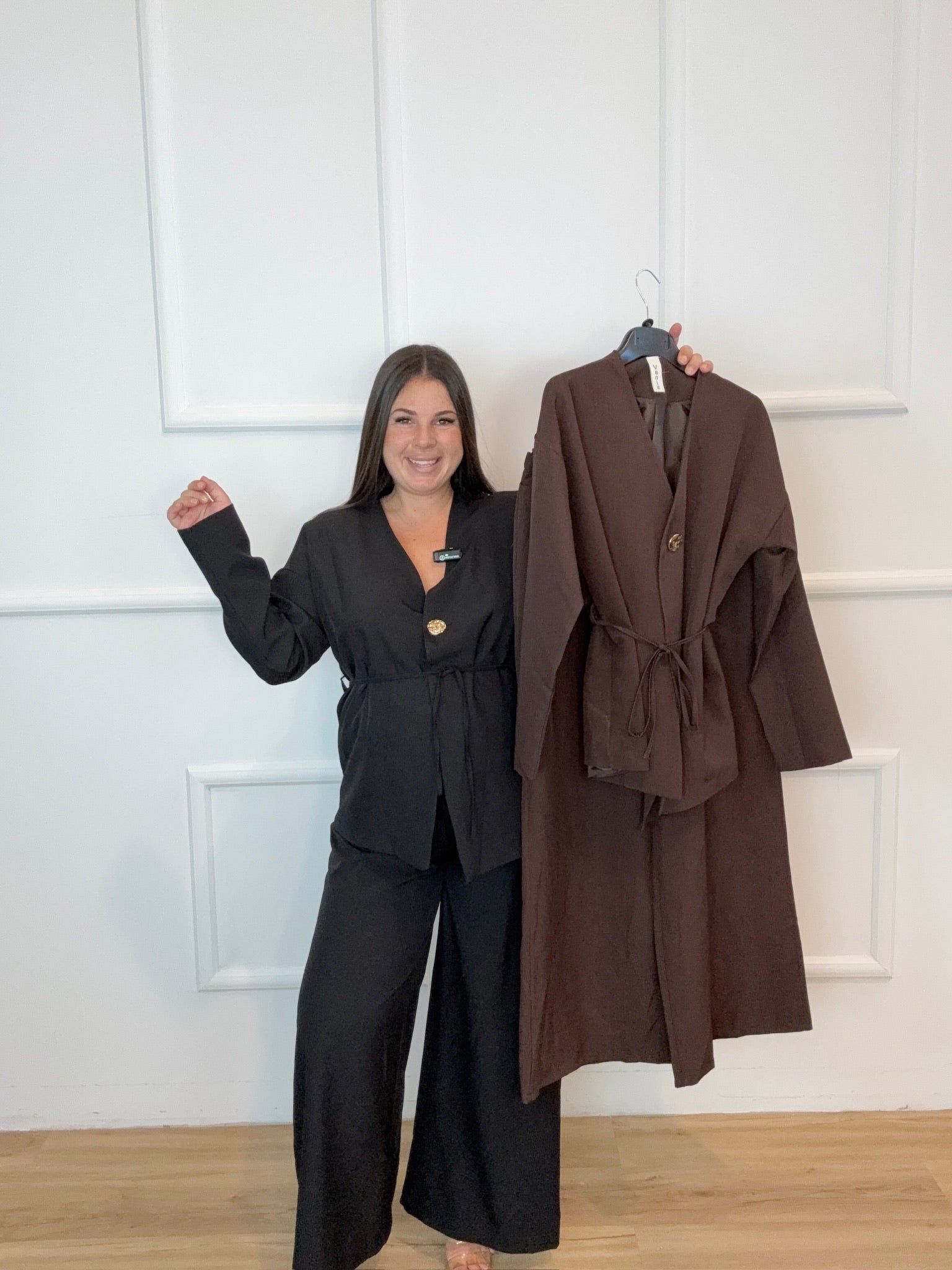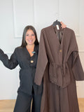 El Traje Miami combina sofisticación y comodidad en un conjunto de líneas limpias y atemporales. Su diseño minimalista con botón central dorado y cinturón fino estiliza la figura, convirtiéndolo en una prenda ideal tanto para el día a día como para ocasiones especiales.