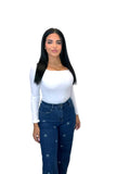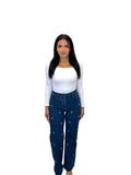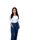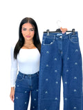 Tallas: XS(34), S(36), M(38), L(40), XL(42). Color: denim con mini lazos bordados. Vaquero de tiro alto y pierna recta, tejido cómodo con bolsillos delanteros y traseros, cierre de botón y cremallera. Ideal para looks casuales con tops básicos o camisas.