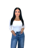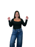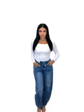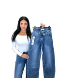 Tallaje: XS(34)–XL(42). Color: denim azul. Vaquero Madrid de tiro alto y pernera ancha. Cintura cruzada con botón descentrado que estiliza y aporta sujeción. Cinco bolsillos y largo completo. Ideal para looks diarios con tops y botines.