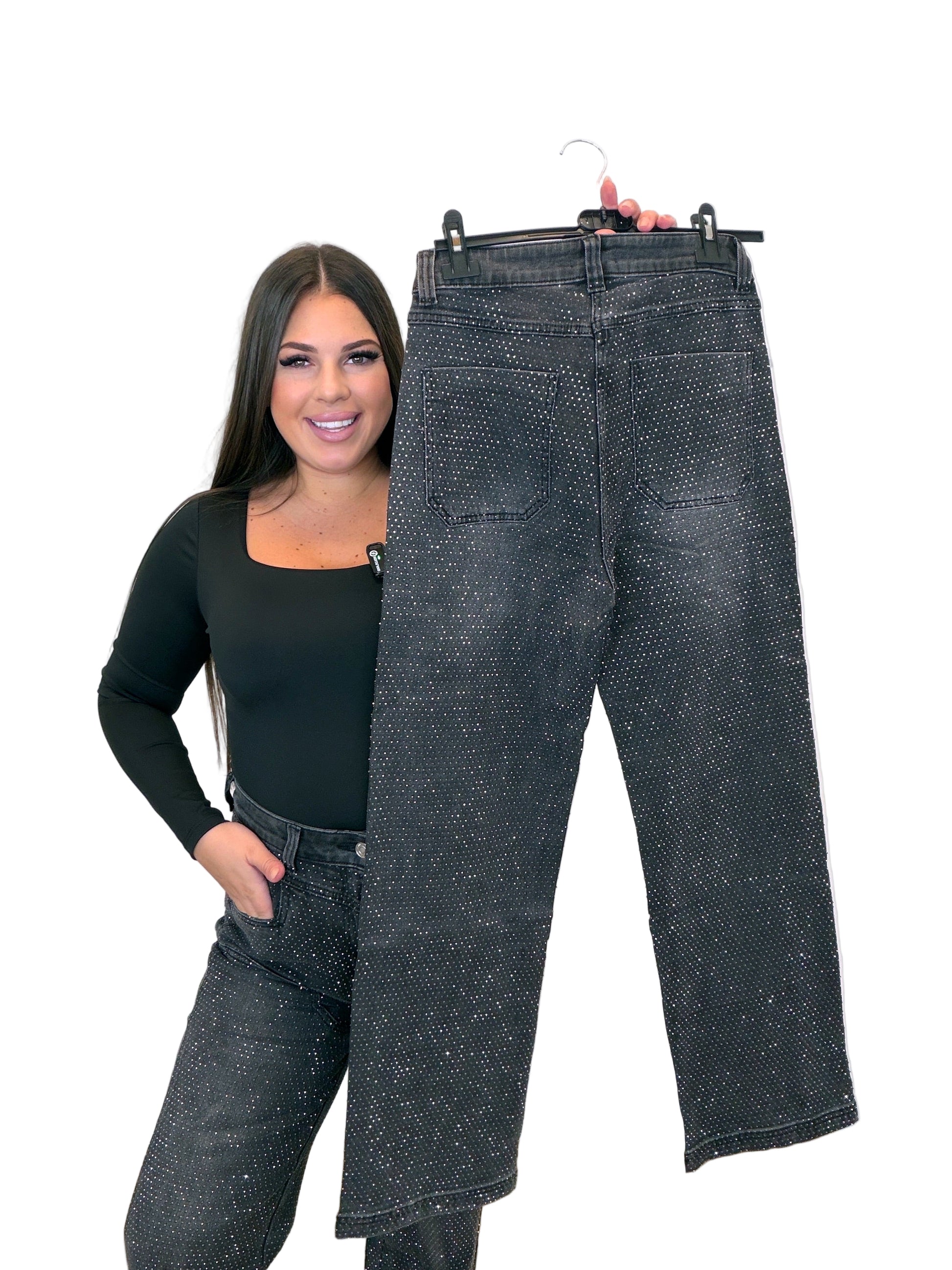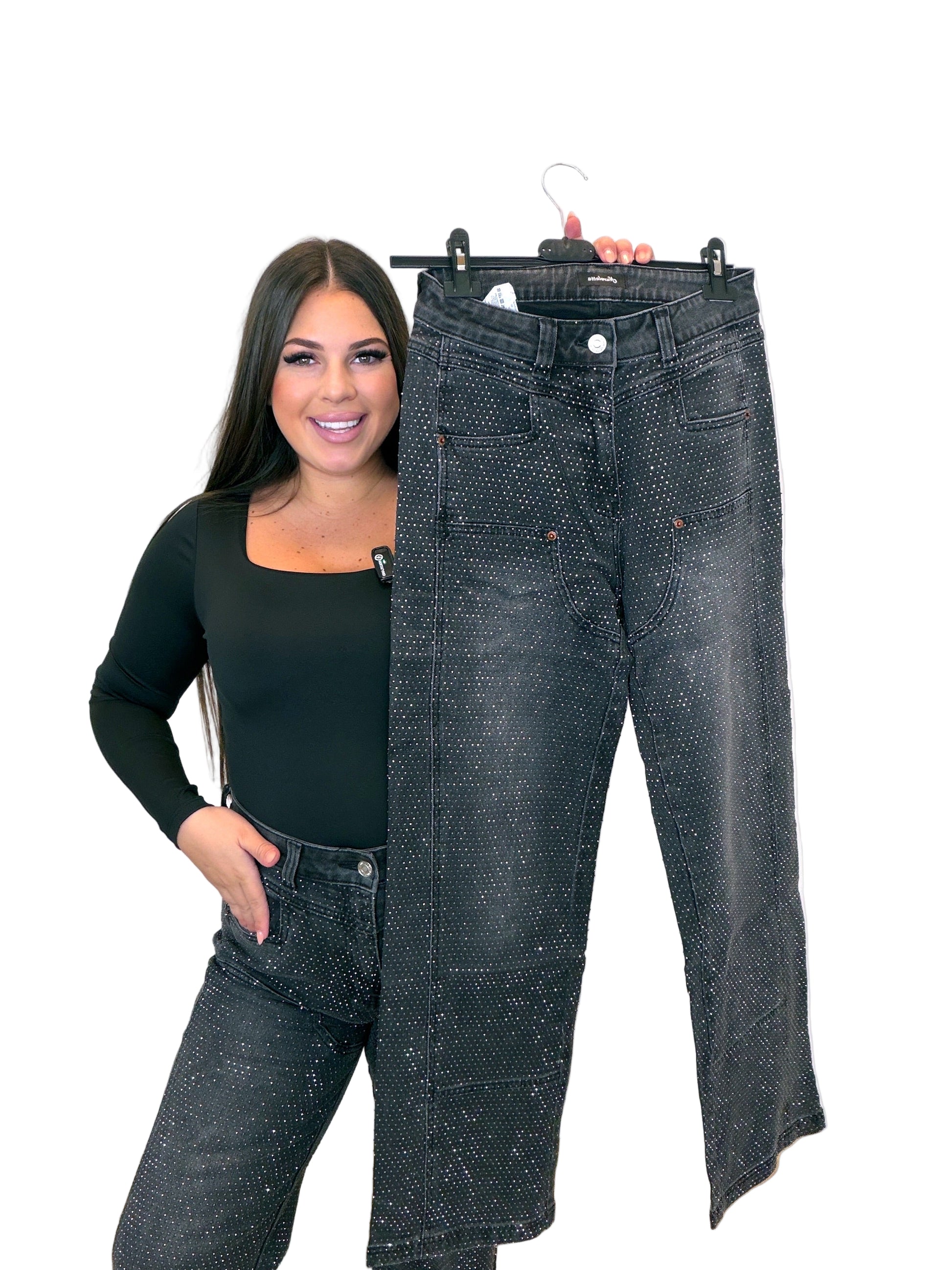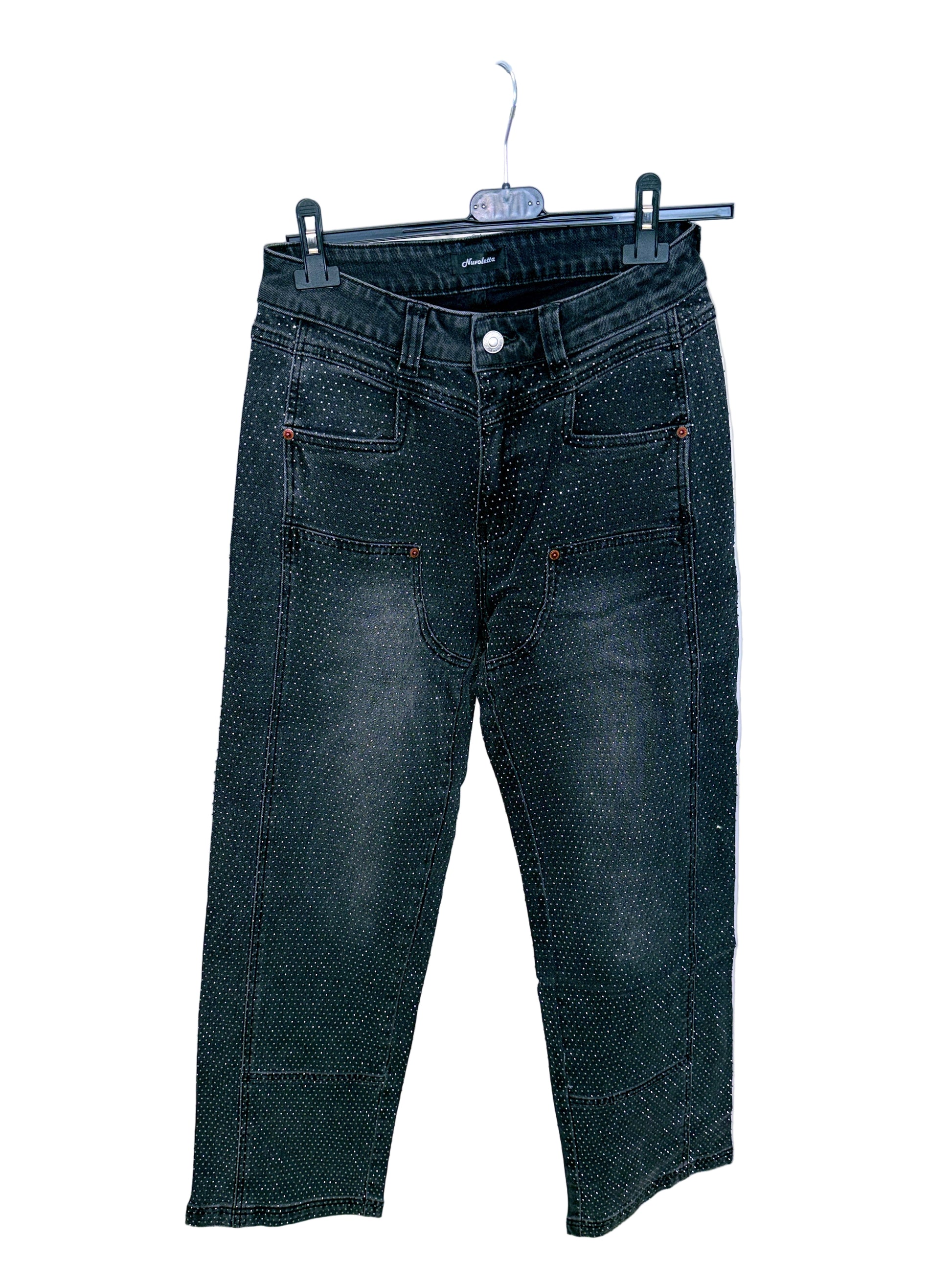 Tallaje: XS(34), S(36), M(38), L(40). Color: Negro brillo. Vaquero con microbrillos que aportan luz sin recargar. Tejido cómodo, cinco bolsillos y cierre de botón y cremallera. Perfecto para elevar looks de día a noche con camisetas básicas, bodies o blazer.
