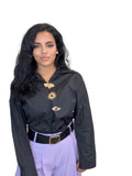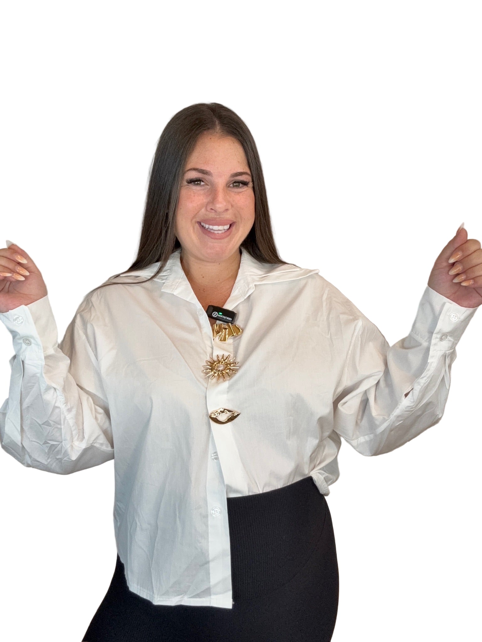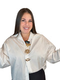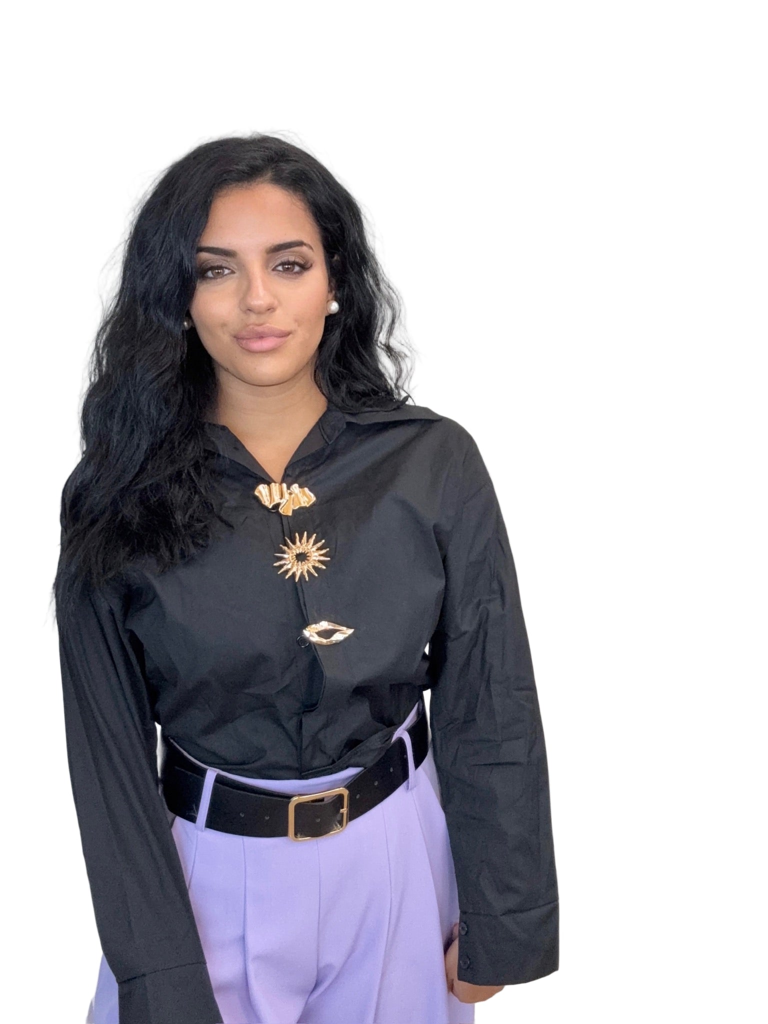 A Camisa Estrela reinventa a clássica camisa preta e branca com um toque de joia: três apliques metálicos dourados (concha, sol/estrela e olho) que fecham e dão destaque ao look. A sua silhueta solta e descontraída proporciona um ajuste limpo e confortável, ajustando-se facilmente dos tamanhos S ao L.