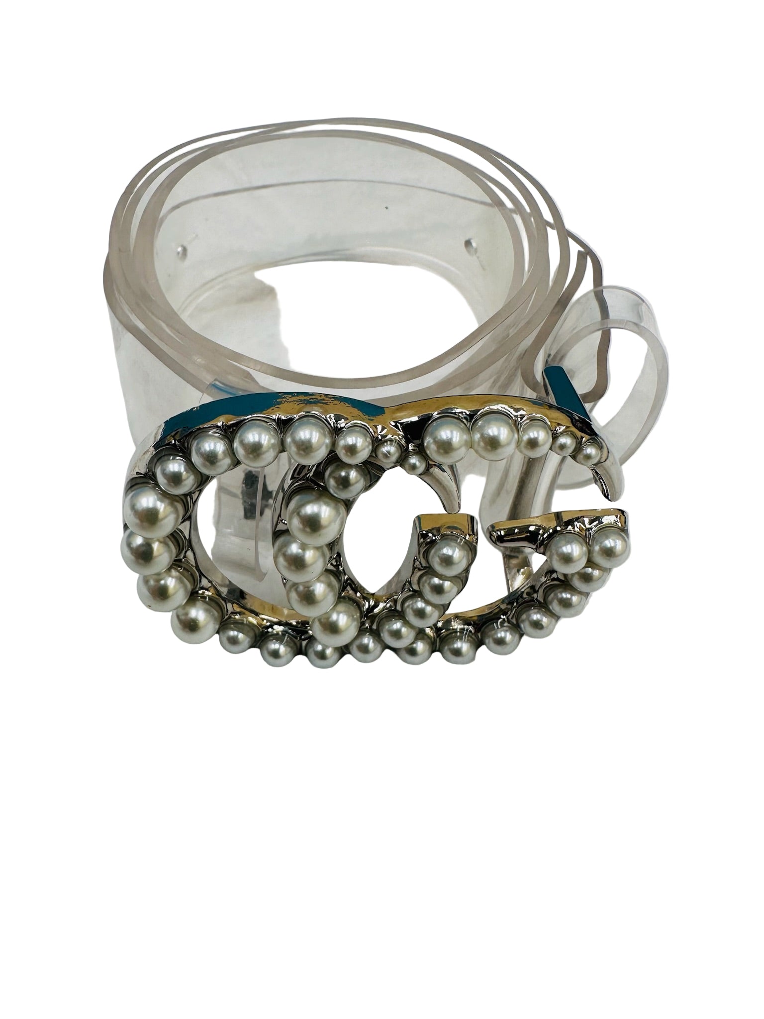 Transparente com fivela prateada e pérolas: combina com qualquer peça, desde jeans a vestidos elegantes.
