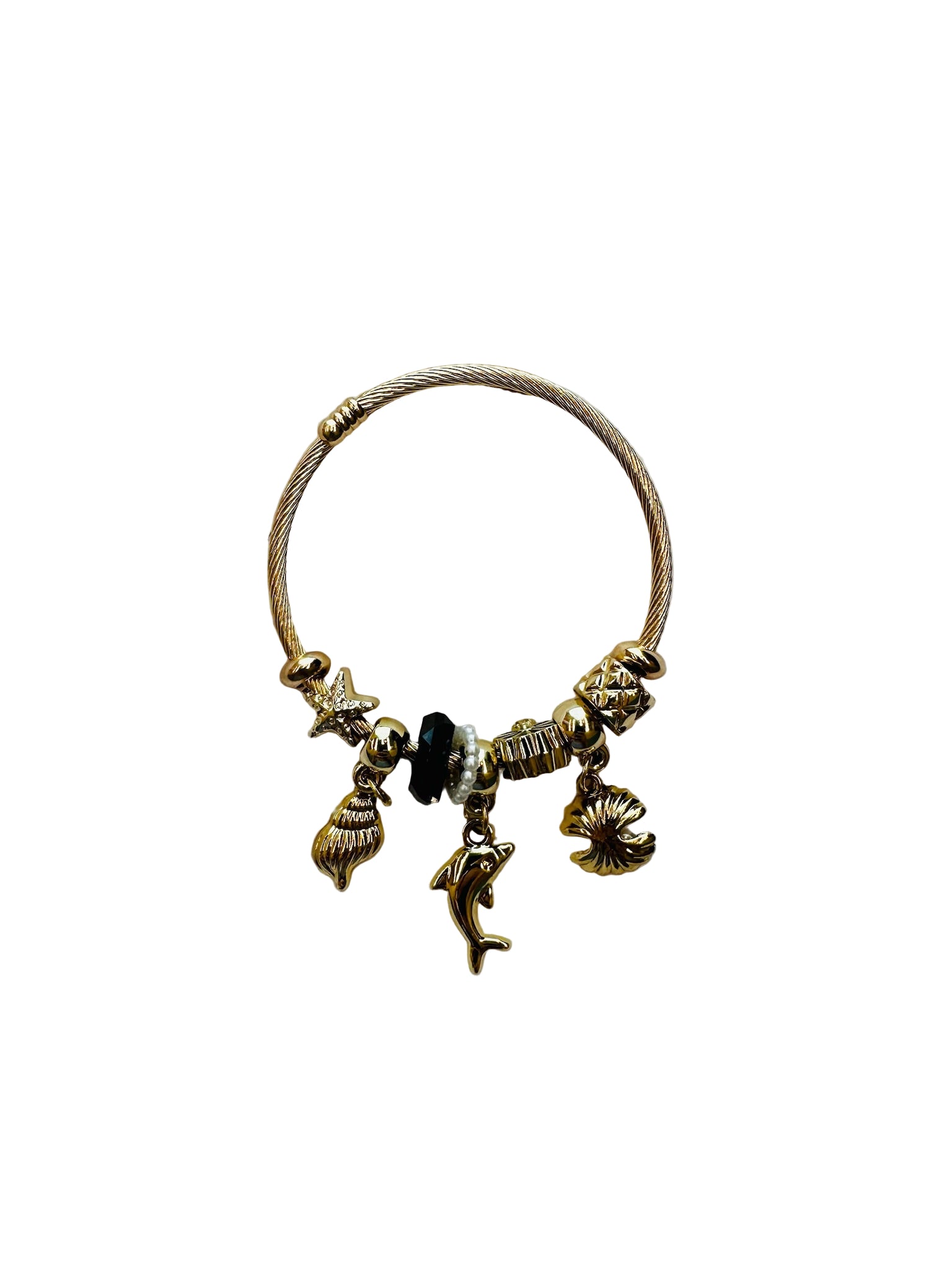 A Pulseira Pandora reinterpreta o espírito náutico numa pulseira de cabo rígido adornada com pendentes pendentes e contas facetadas. Disponível em acabamentos dourado ou prateado, acrescenta um toque de leveza e movimento ao pulso, combinando facilmente com looks casuais e mais sofisticados.